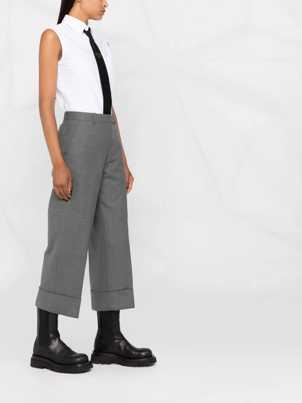 Фирменная деталь в полоску, петли для ремня, потайная застежка спереди, два прорезных кармана по бокам, два кармана с листочкой сзади, прямой крой, укороченная длина и подвернутые манжеты. Цвет: серый.