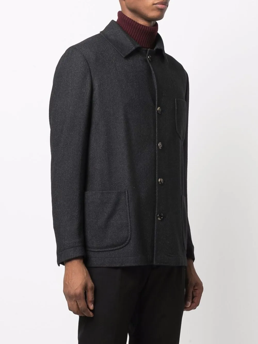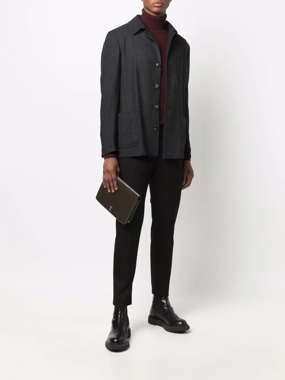 Зазубренные лацканы, застежка на пуговицах спереди, три накладных кармана спереди, длинные рукава, манжеты на пуговицах, шлица по центру сзади и прямой подол.