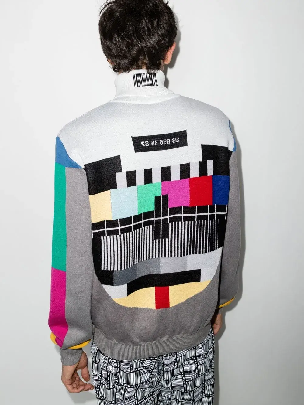 Серый, разноцветный, смесовая шерсть мериноса, вязка в технике интарсия, высокий воротник, длинные рукава, манжеты в рубчик и подол в рубчик.