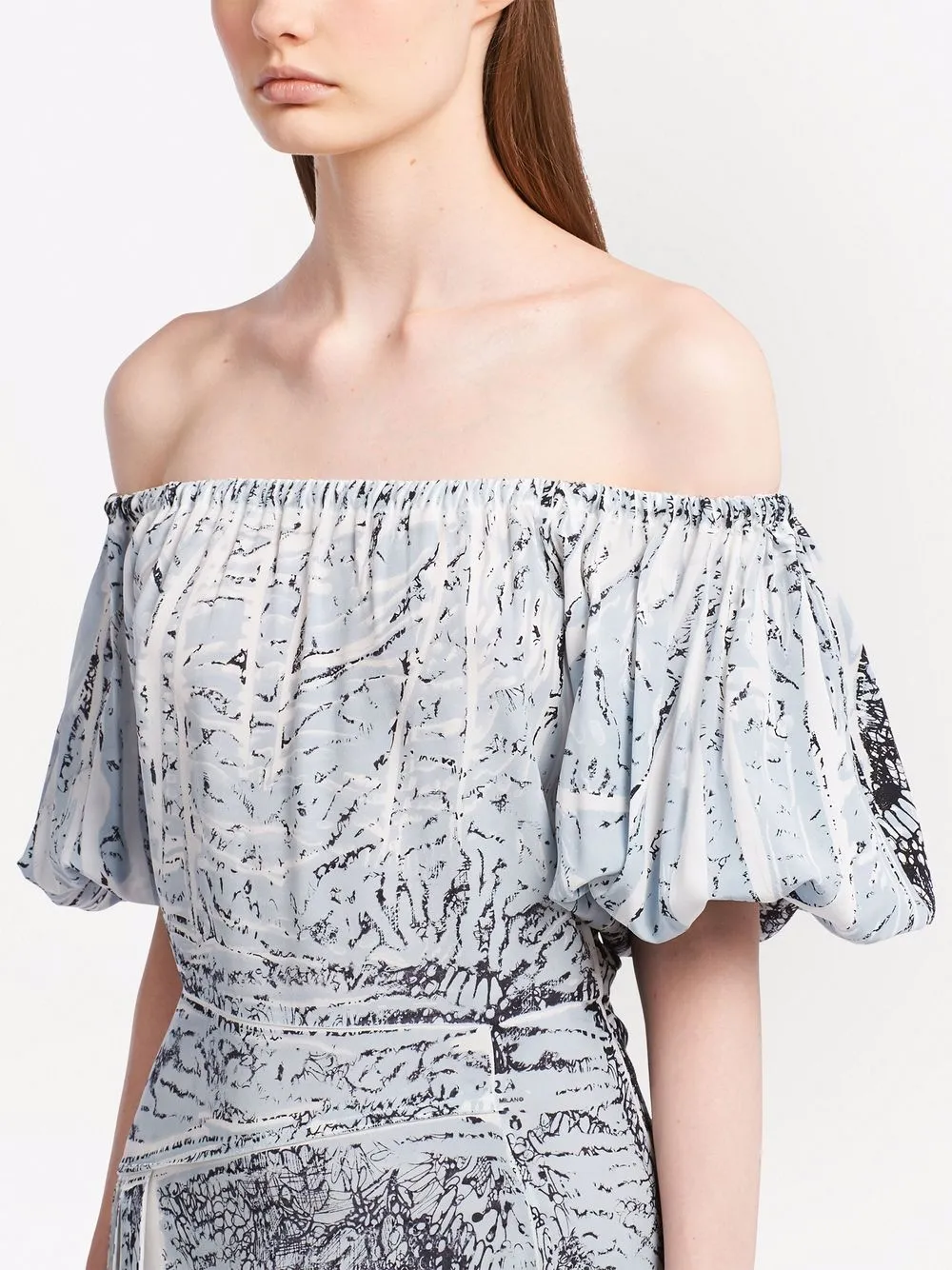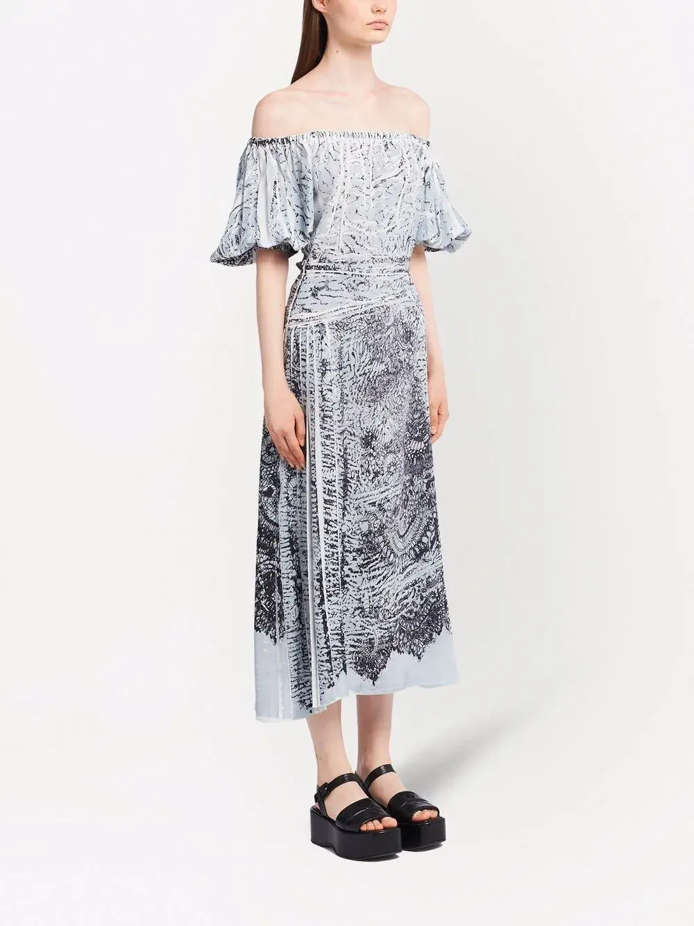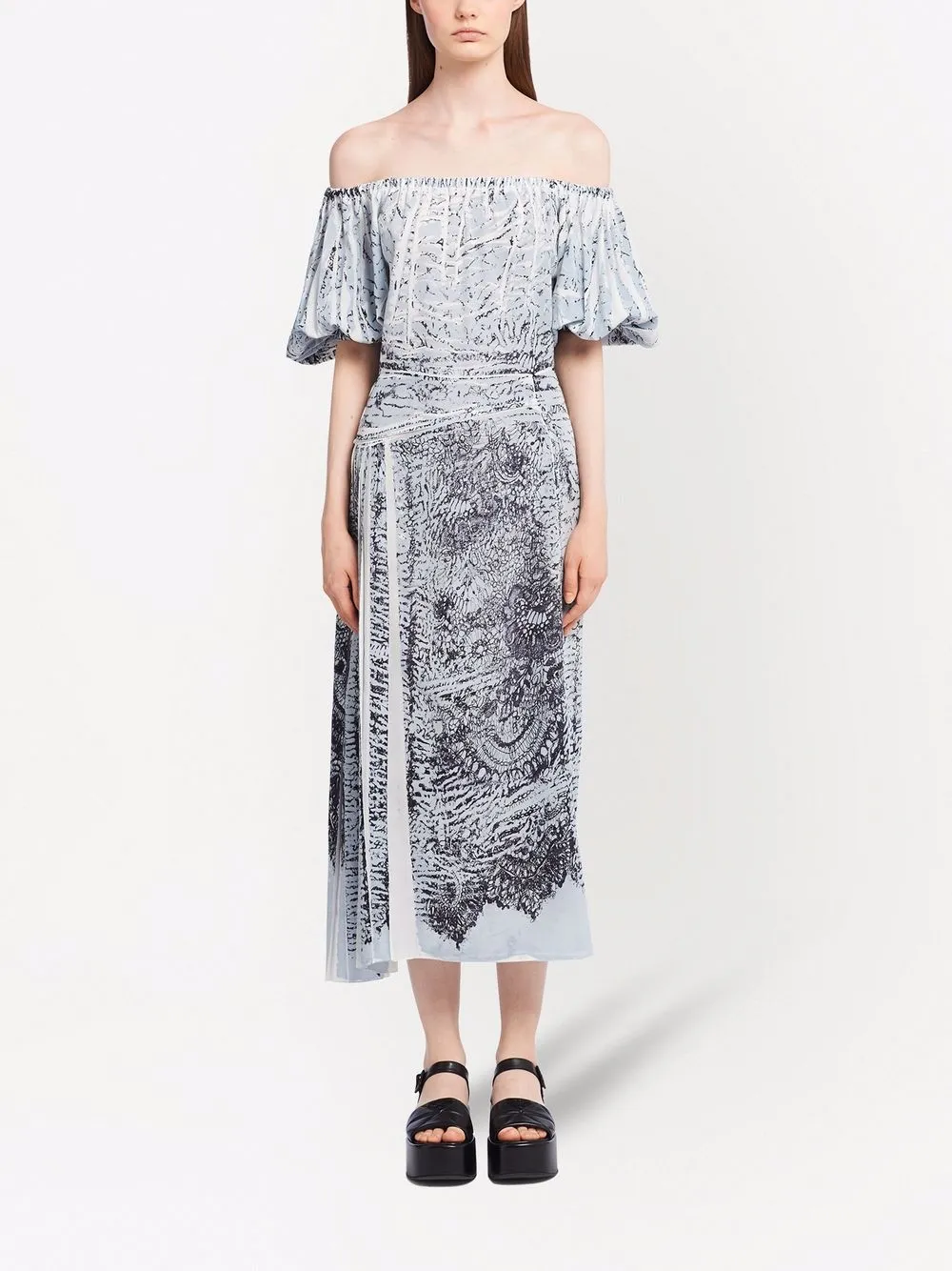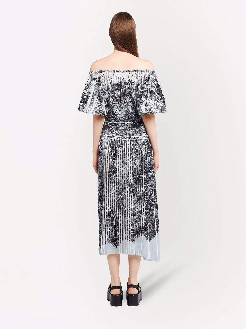 Абстрактный принт, открытые плечи, короткие рукава, эластичная отделка и длина миди.