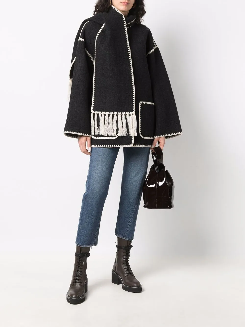 Вышивка, декоративный шарф, длинные широкие рукава, застежка на пуговицах спереди и два передних кармана.