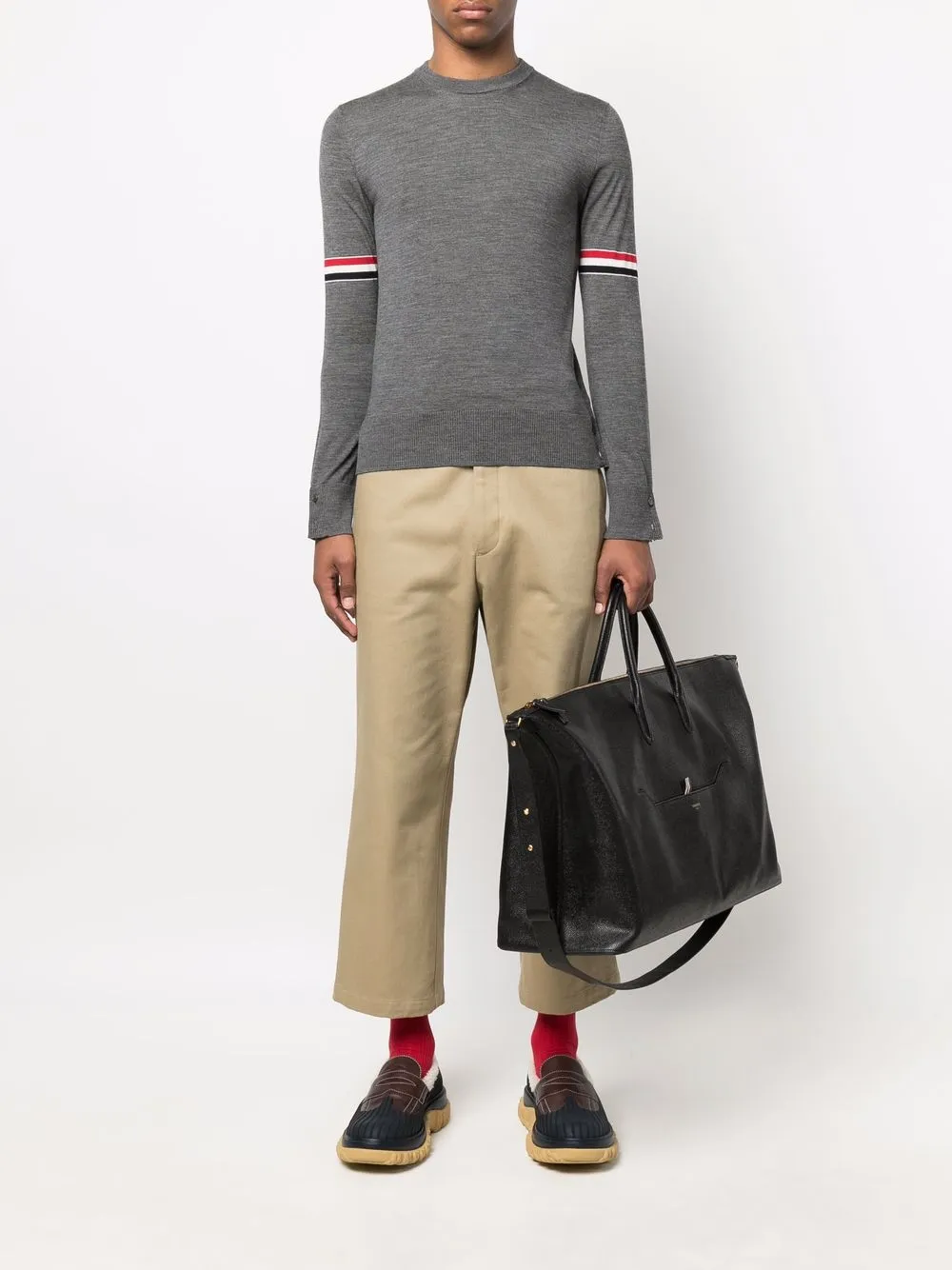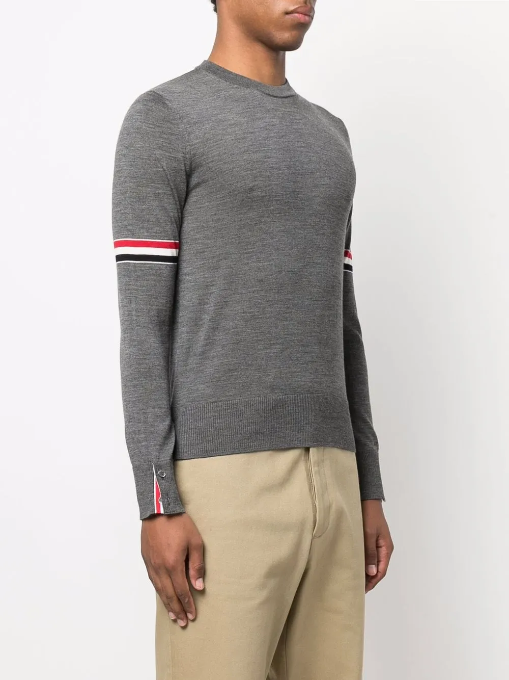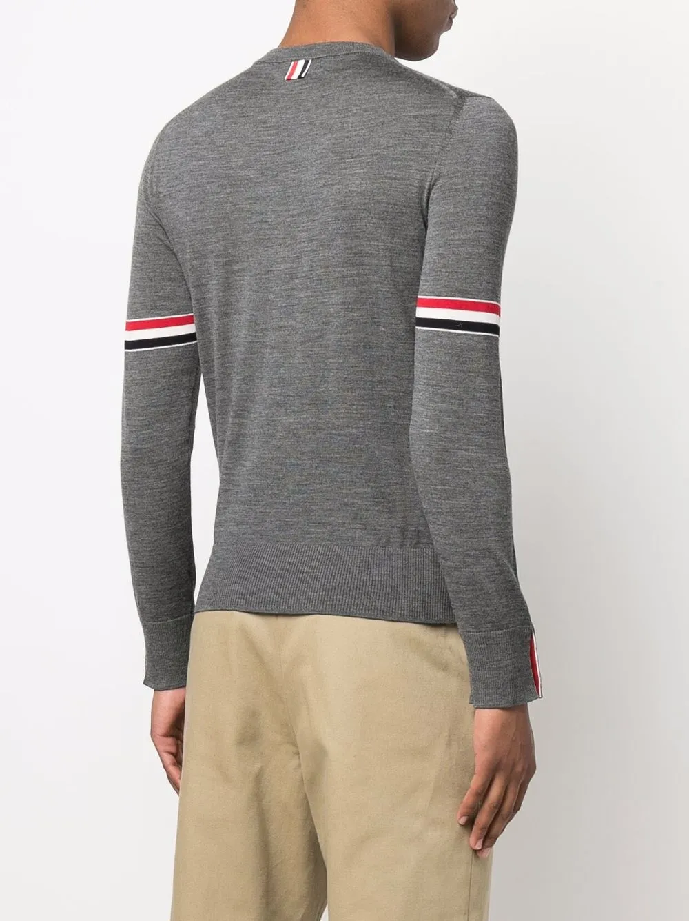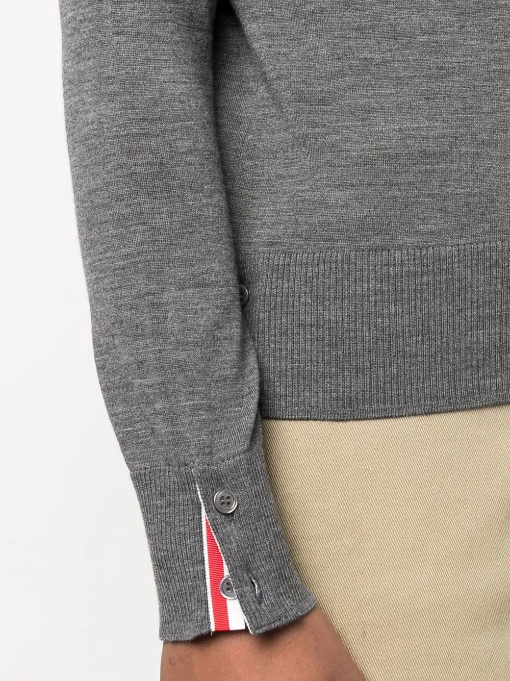 Серый, шерсть мериноса, полоски RWB, знаковая деталь в полоску, круглый вырез, длинные рукава и манжеты на пуговицах.