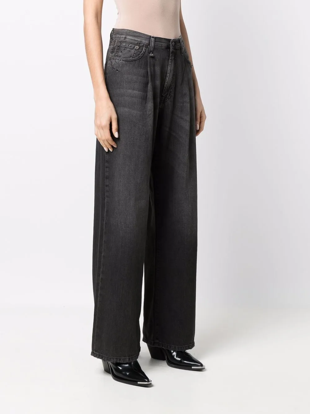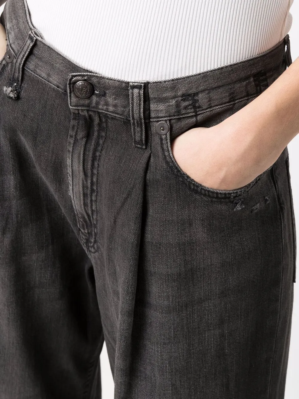 Обработанный деним, завышенная талия, свободный крой, ширинка на пуговицах, петли для ремня, классическая пятикарманная модель и необработанные края.