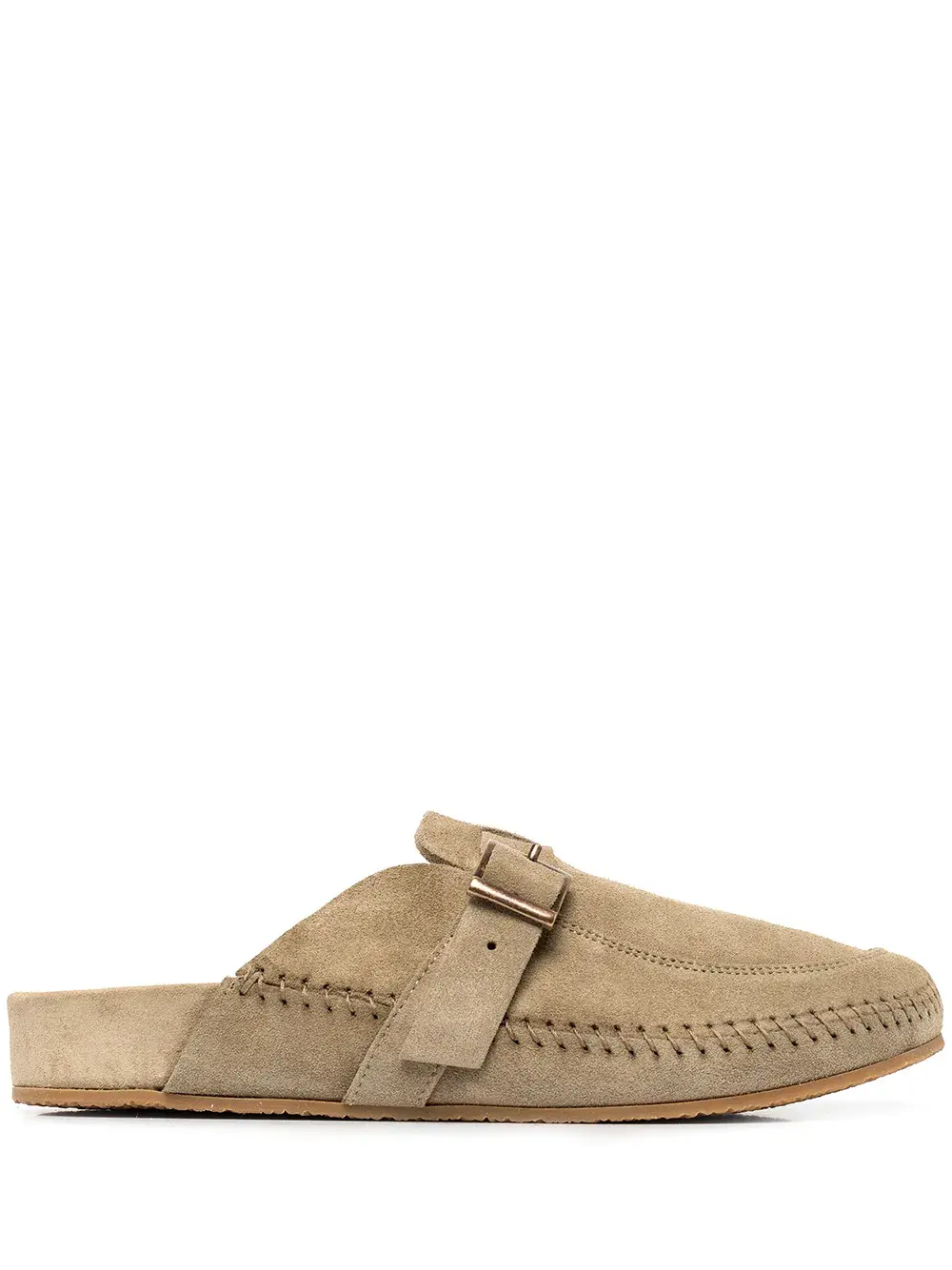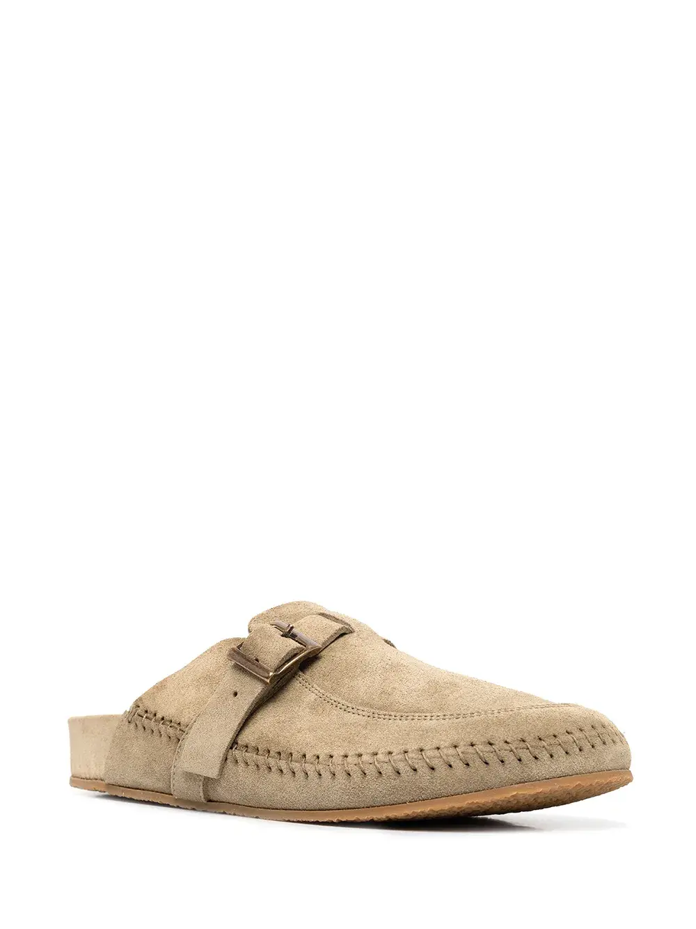 Полукруговой шов на носке, модель без застежки, застежка на пряжке и ремешке и плоская резиновая подошва.
