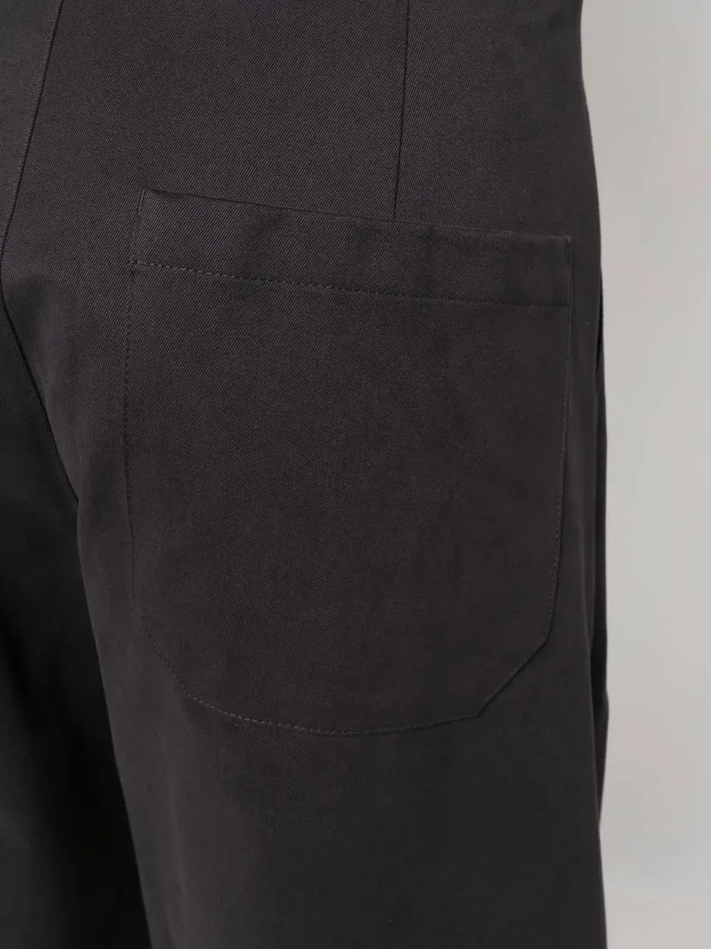 Темно-синий, хлопок, петли для ремня, застежка на молнии и пуговице спереди, прорезные карманы по бокам, два накладных кармана сзади и широкий крой.