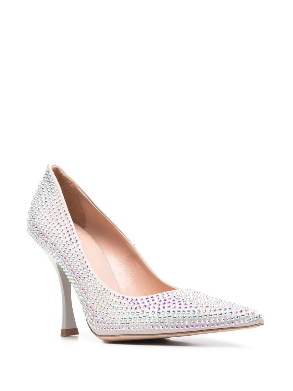 Разноцветный, кожа, модель без застежки, декор из кристаллов, заостренный носок, кожаная стелька с логотипом и высокий скульптурный каблук.