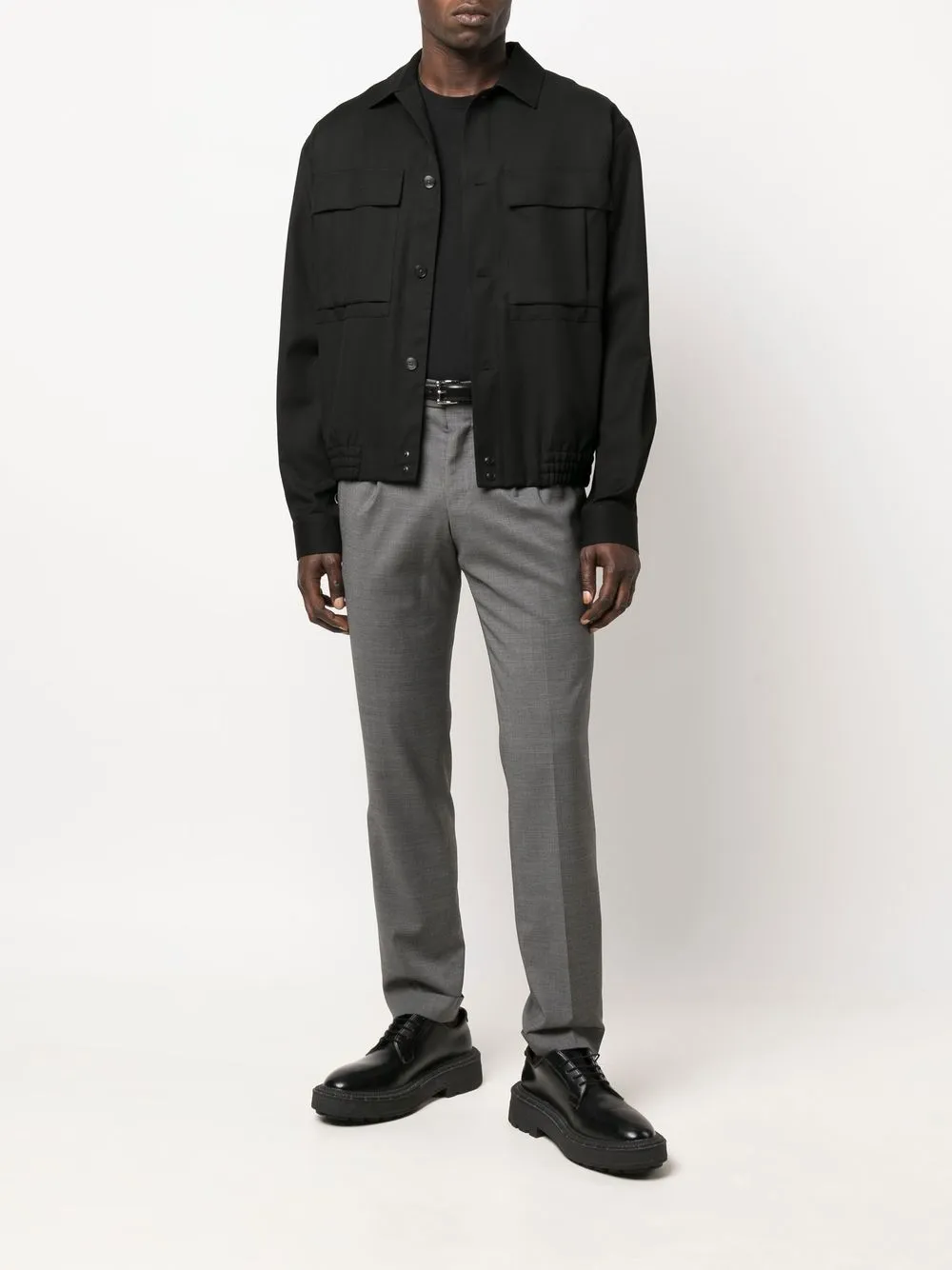 Шиферно-серый, смесовая необработанная шерсть, эластичный материал, средняя посадка, потайная застежка спереди, два прорезных кармана по бокам, два кармана с клапанами сзади и зауженный крой.