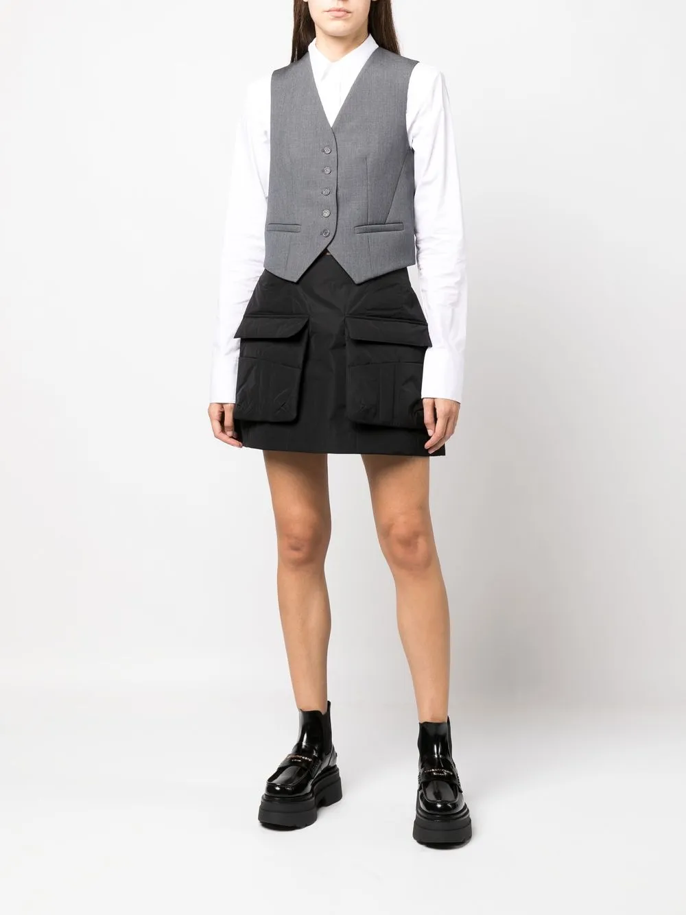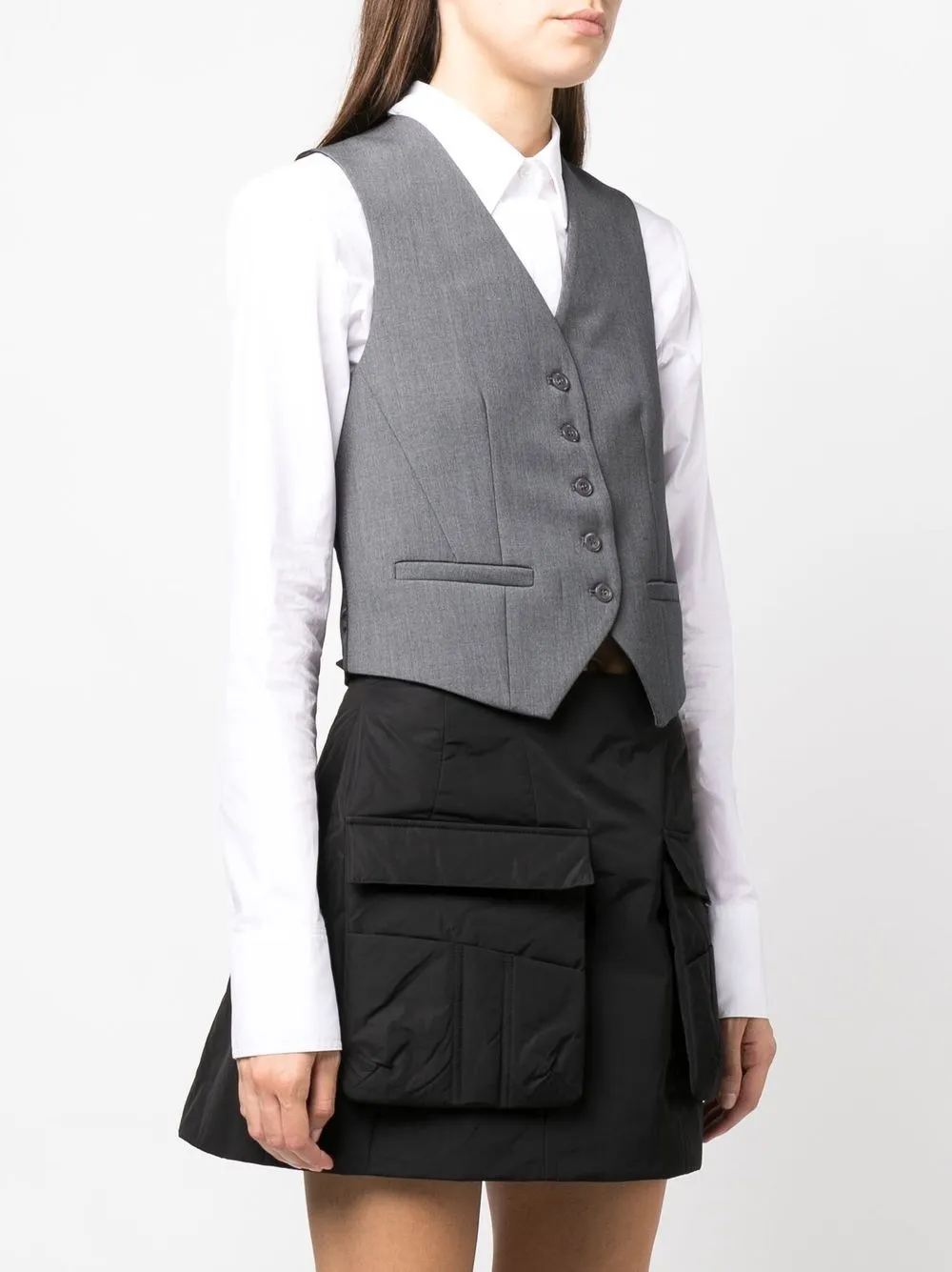 Серый, смесовая шерсть, V-образный вырез, застежка на пуговицах спереди, два боковых кармана с листочкой, без рукавов и регулируемый дизайн. Ответственный выбор: Этот товар как минимум на 50% состоит из материалов, которые признаны более безопасными для окружающей среды или сертифицированы независимыми организациями.