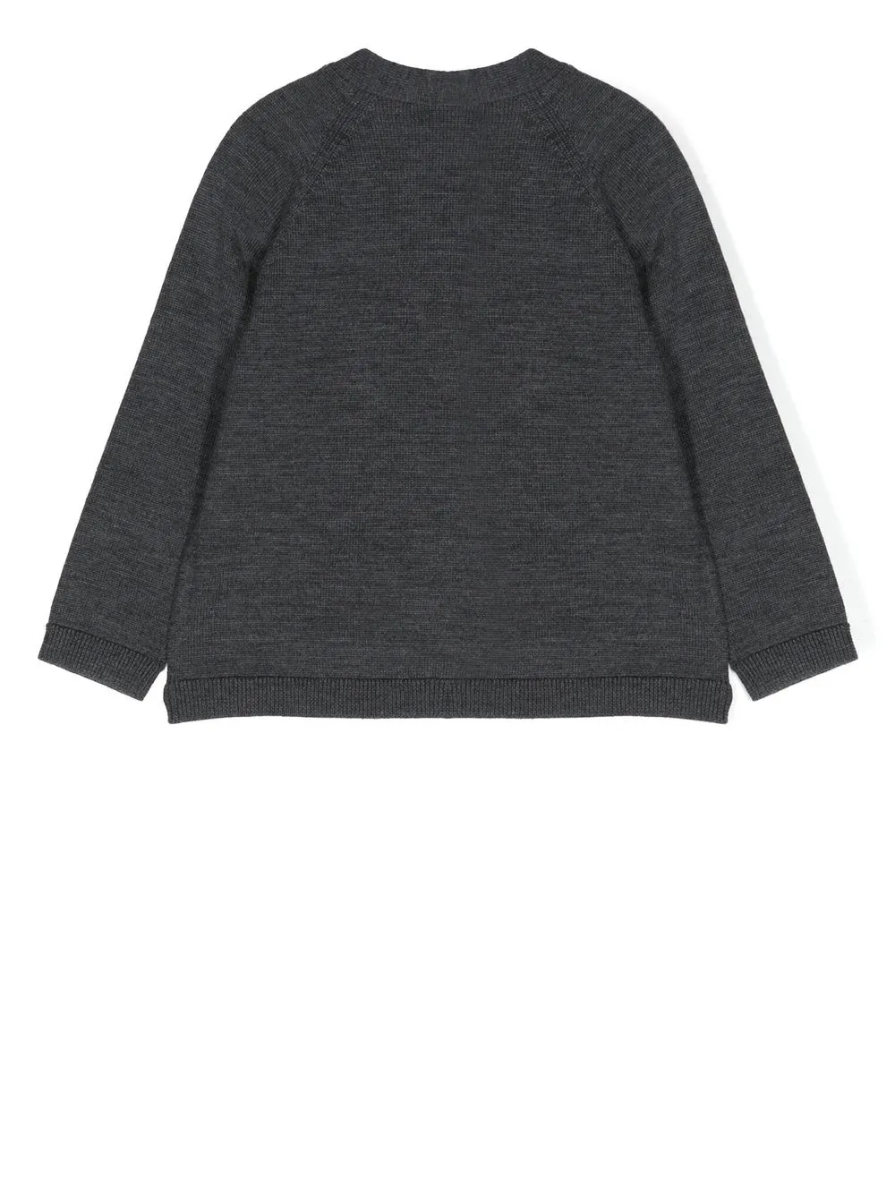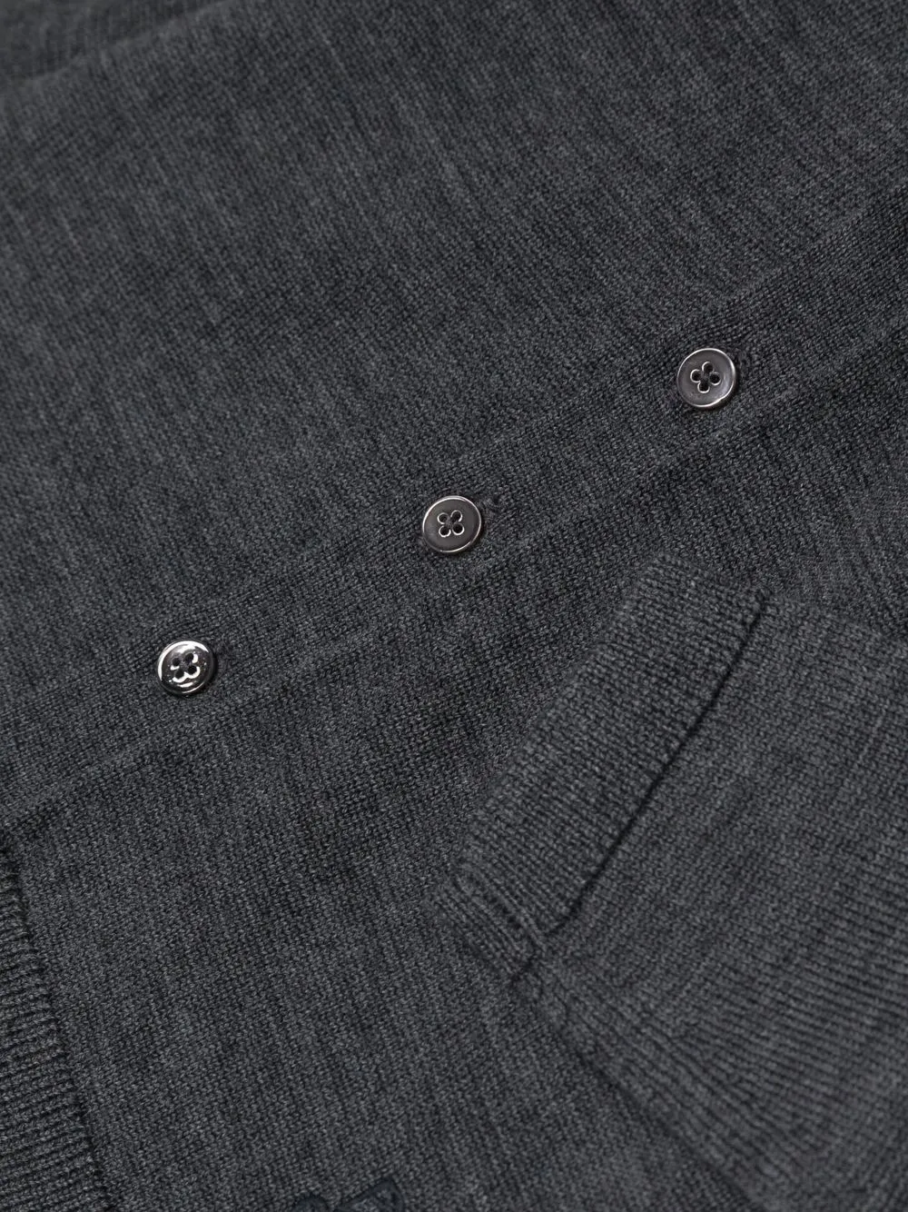 Серый, шерсть мериноса, V-образный вырез, застежка на пуговицах спереди, длинные рукава и подол в рубчик.
