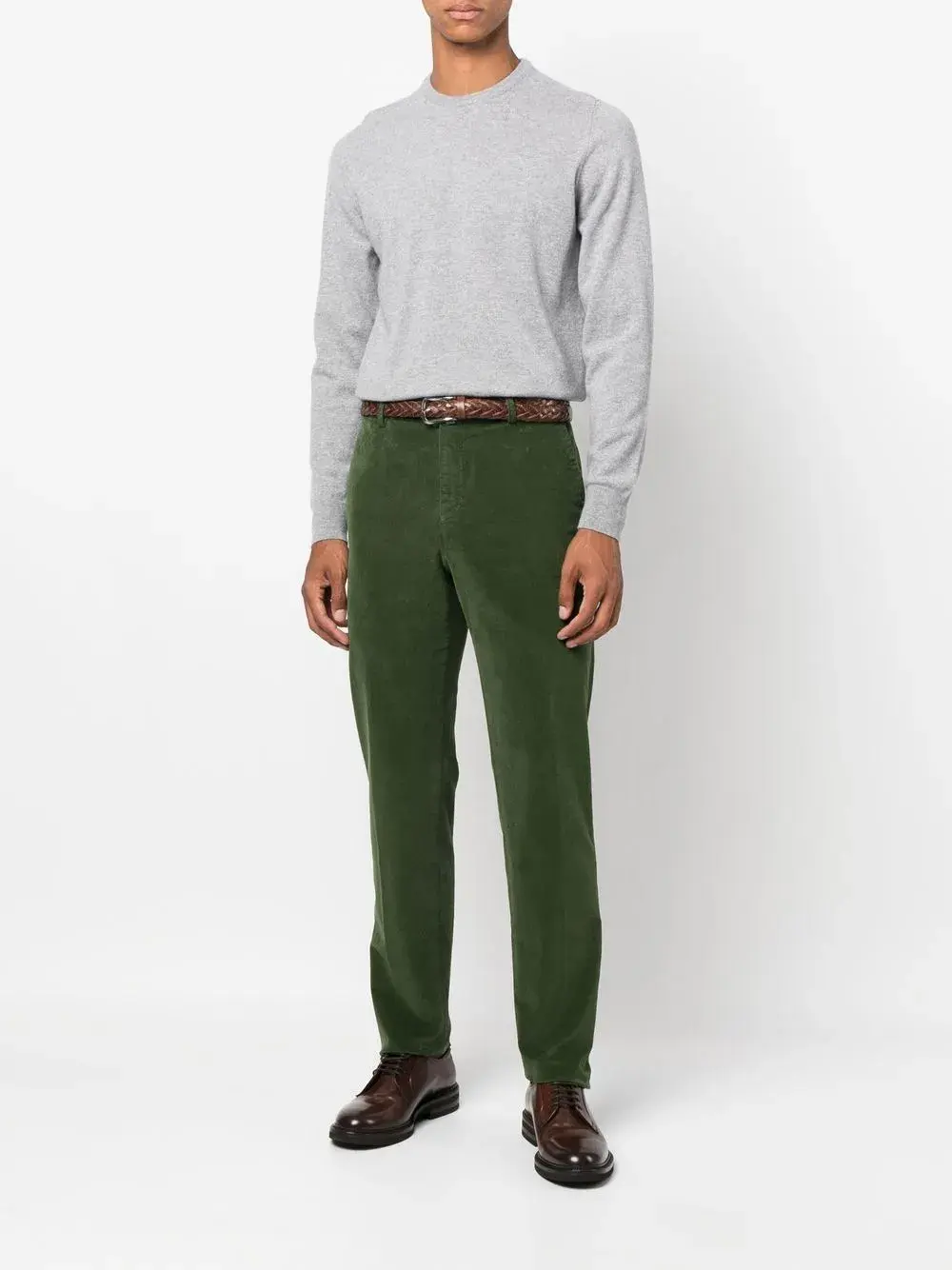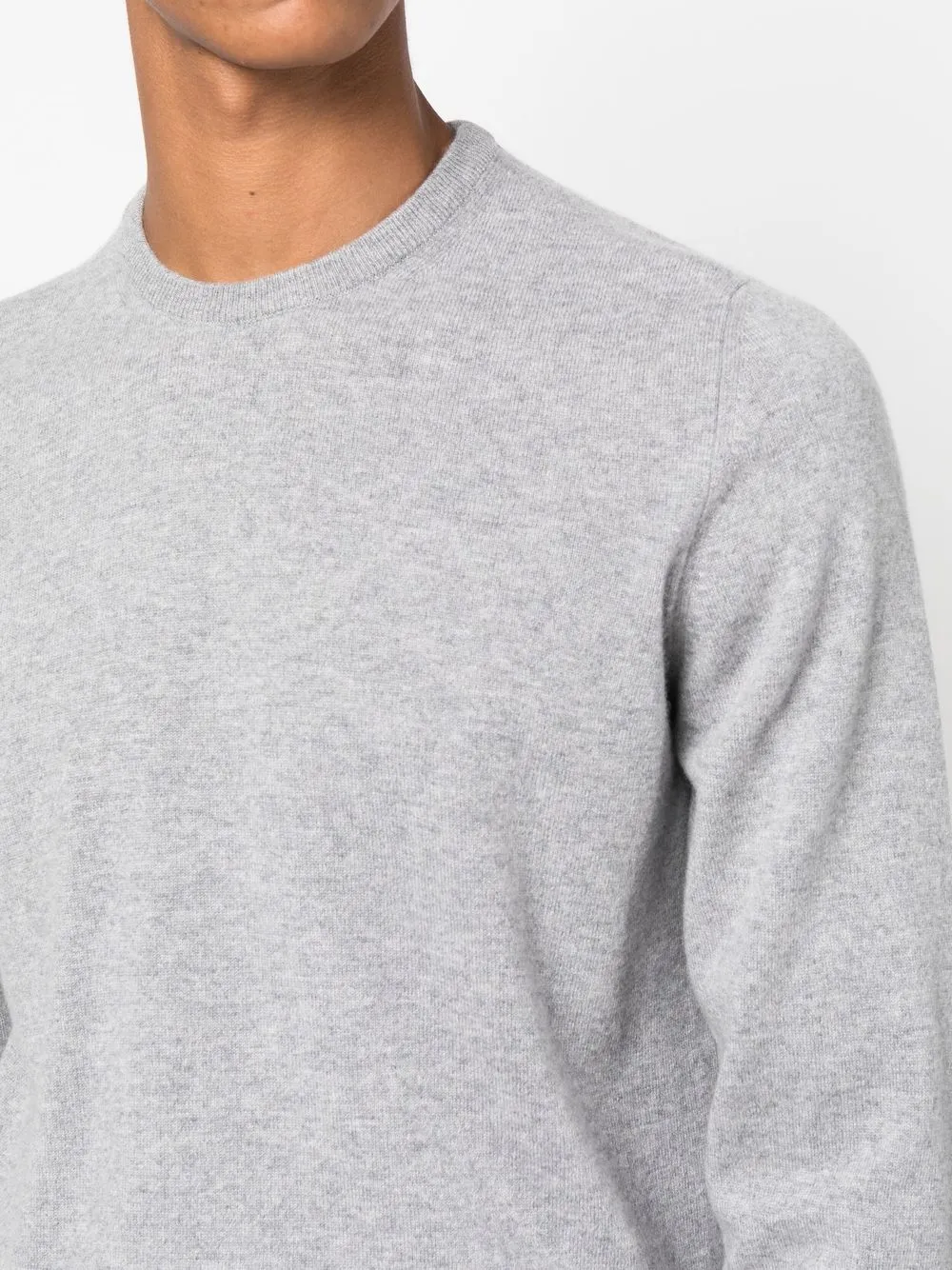 Светло-серый, кашемир, трикотажный материал, края в рубчик, круглый вырез, длинные рукава и прямой подол.