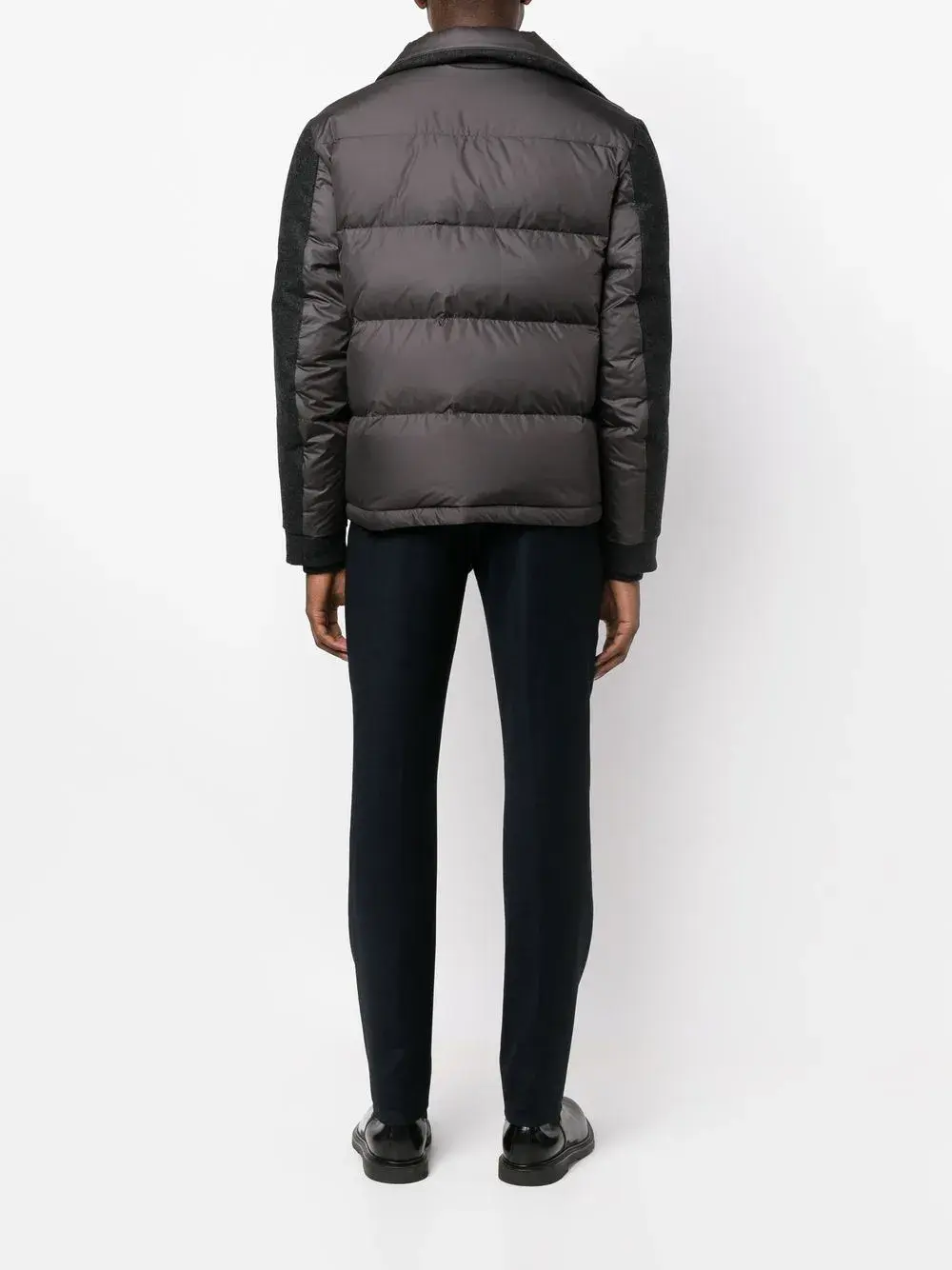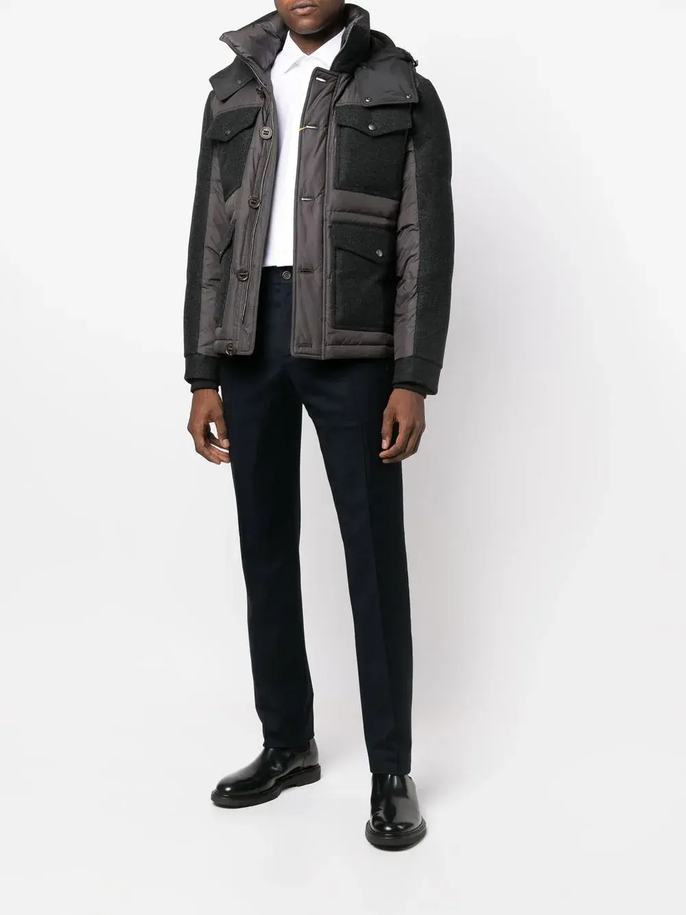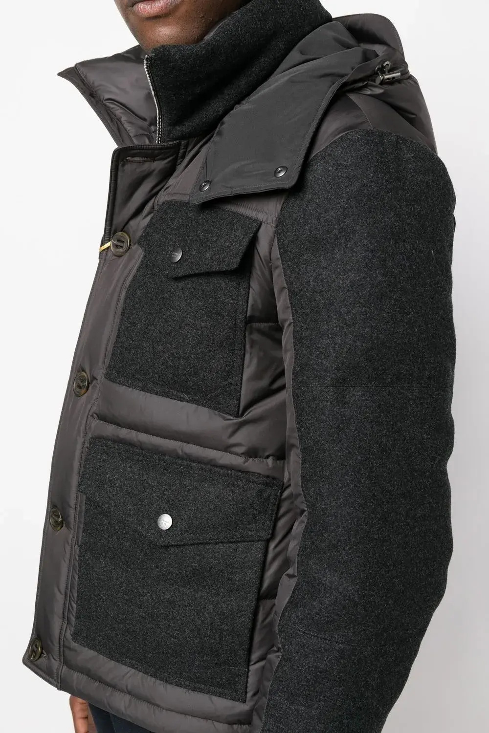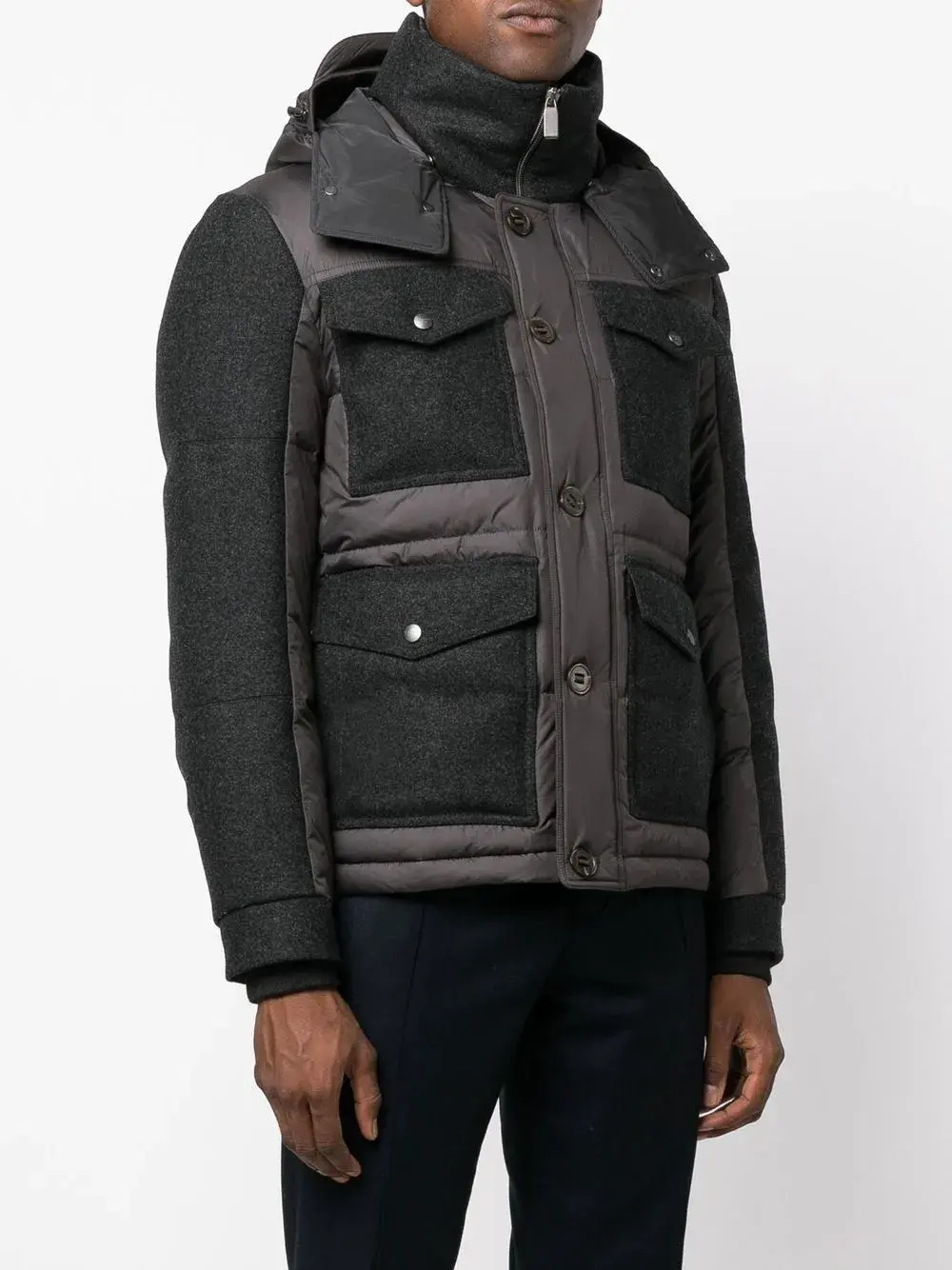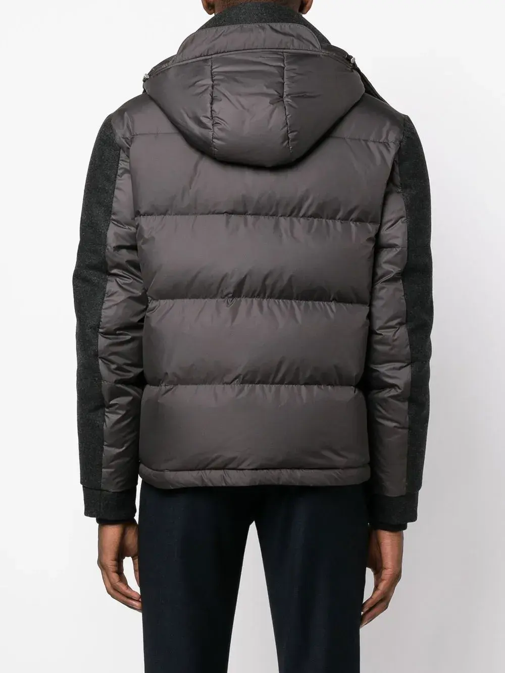 Серый, наполнитель из пуха и перьев, застежка на пуговицы, классический капюшон, потайная застежка спереди и четыре накладных кармана спереди.