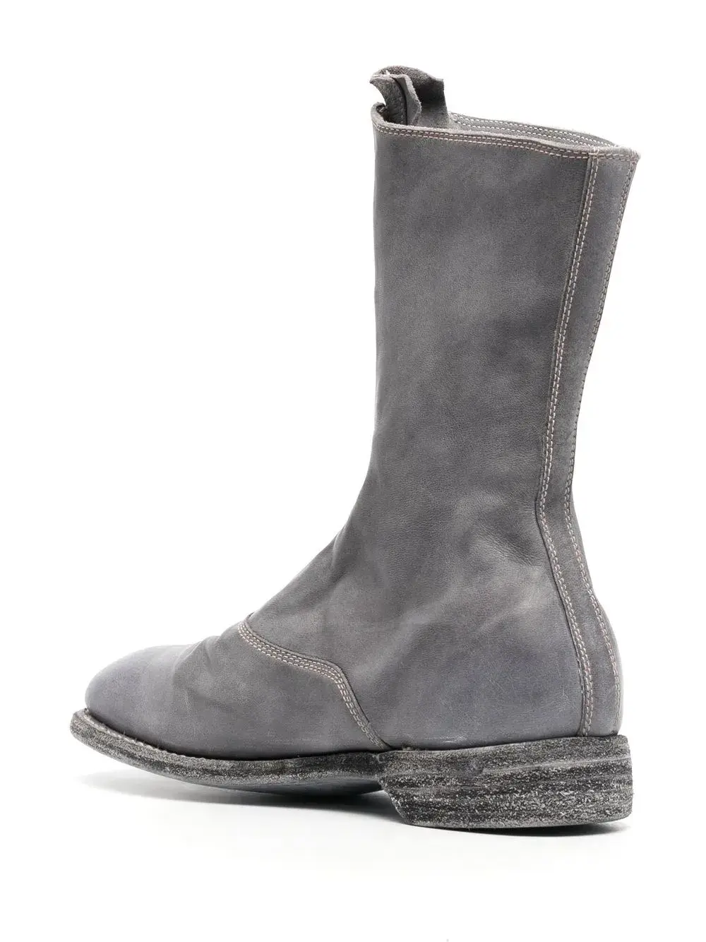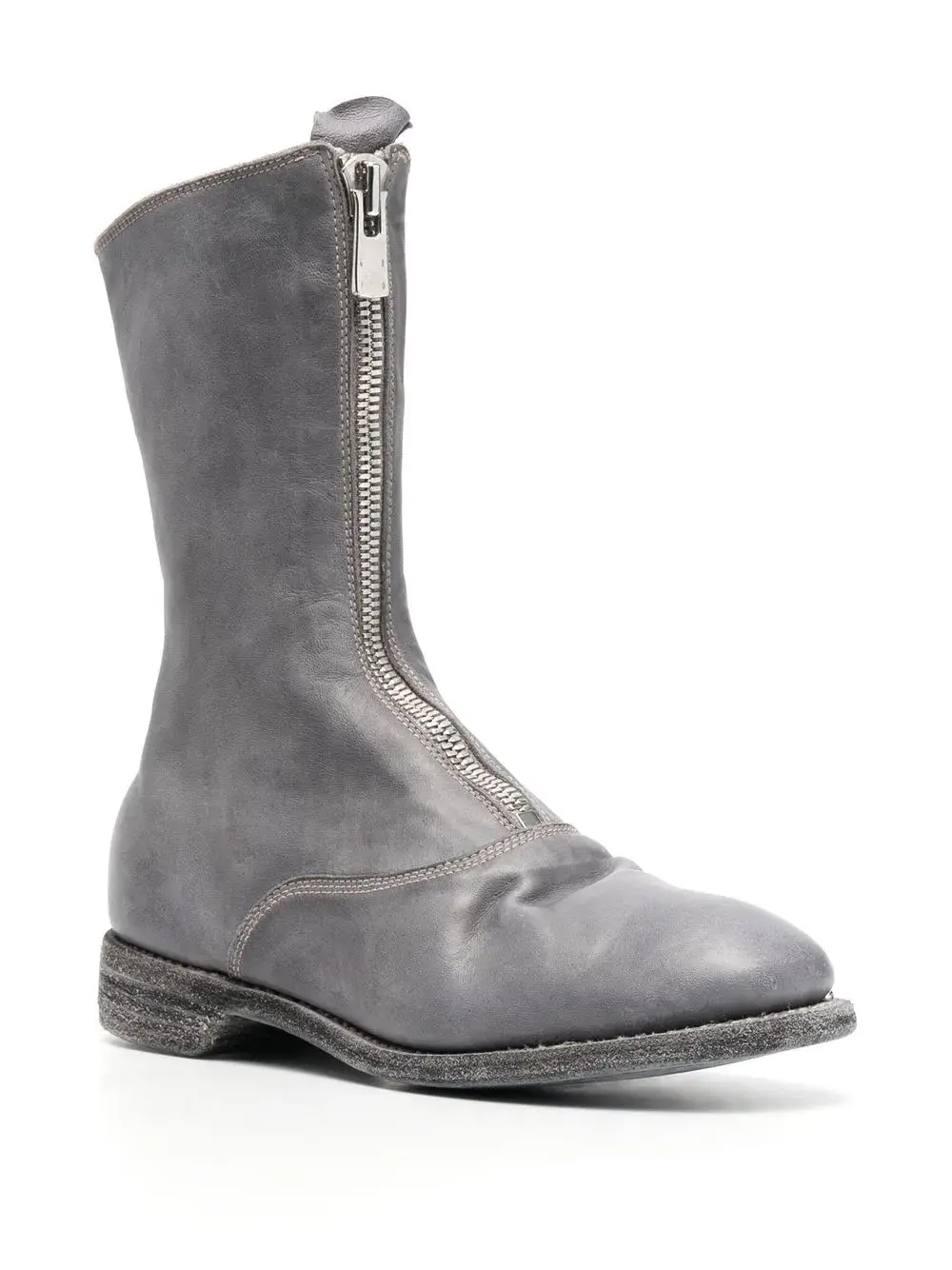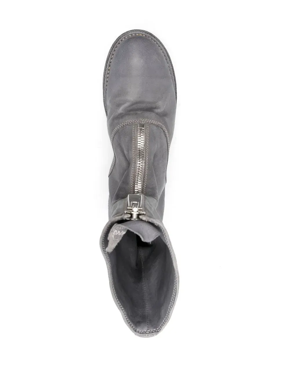 Холодный серый, телячья кожа, закругленный носок, застежка на молнии спереди, низкий блочный каблук и телячья кожа.