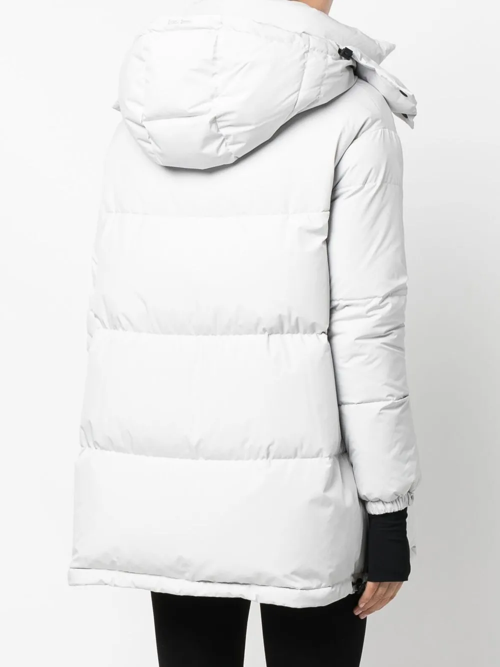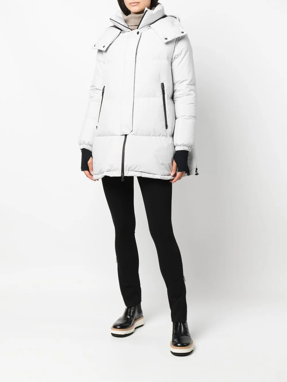 Светло-серый, наполнитель из пуха и перьев, дутый материал, классический капюшон, высокий воротник, потайная молния спереди, два кармана на молнии по бокам, длинные рукава и прямой подол.