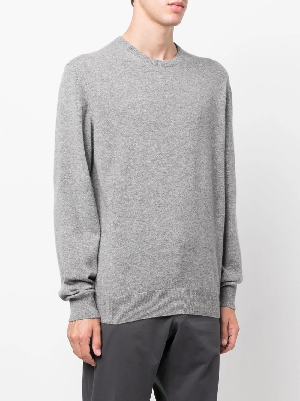 Серый, кашемир, тонкая вязка, круглый вырез, длинные рукава и подол в рубчик.