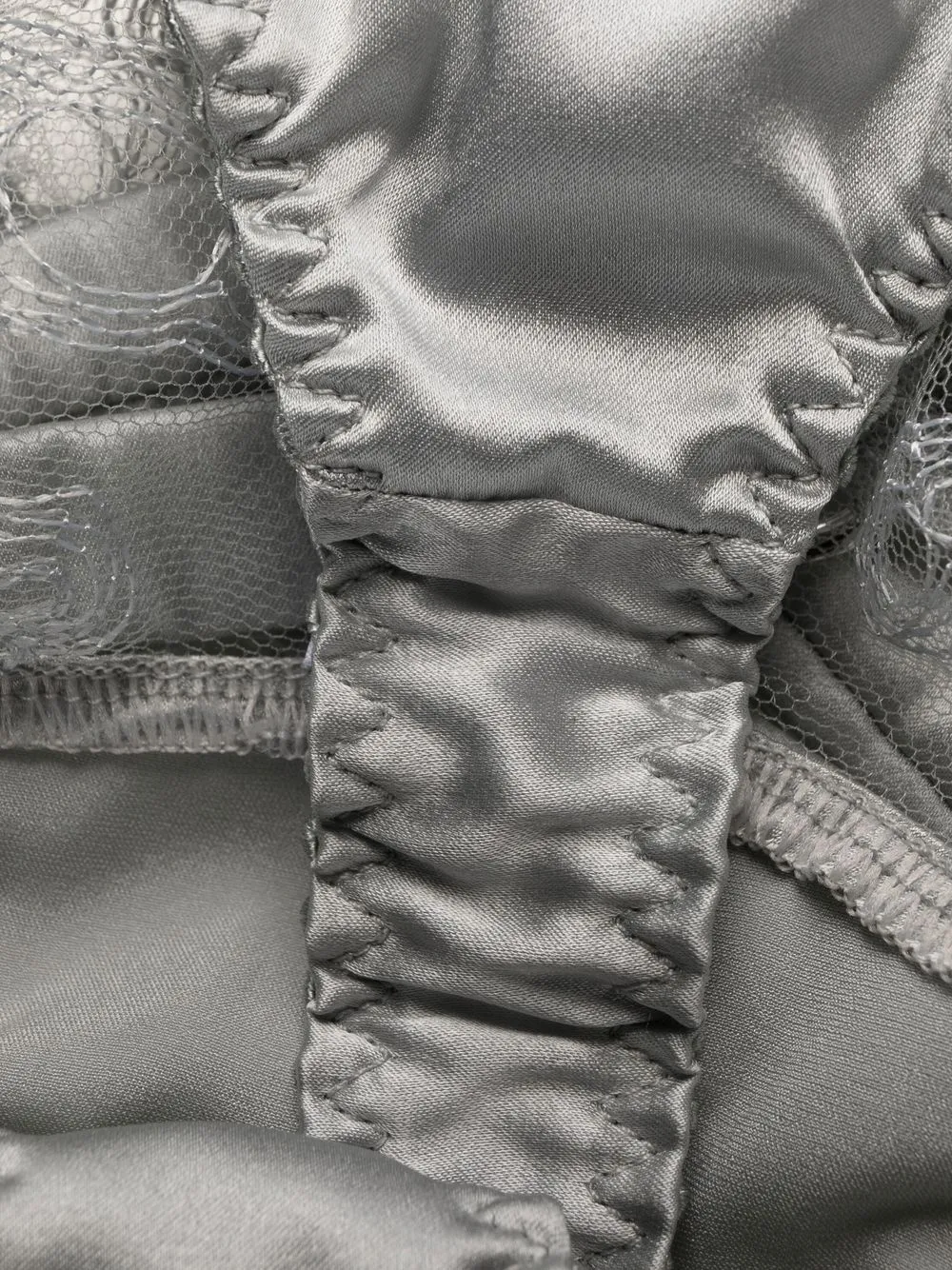 Серый, смесовый шелк, прозрачные кружевные вставки и эластичный пояс.