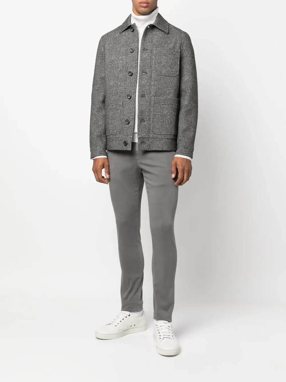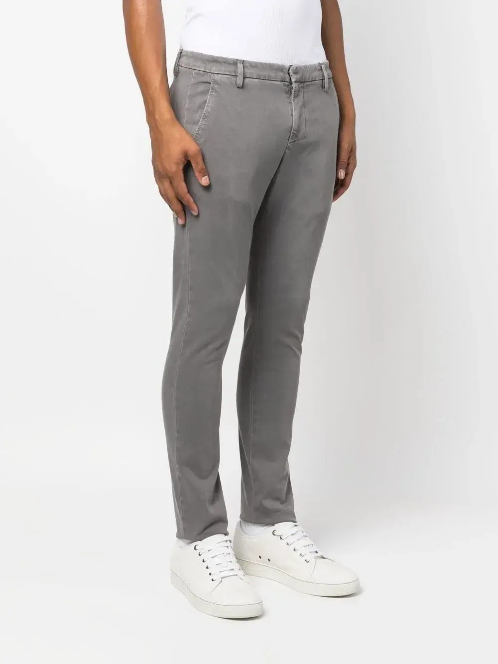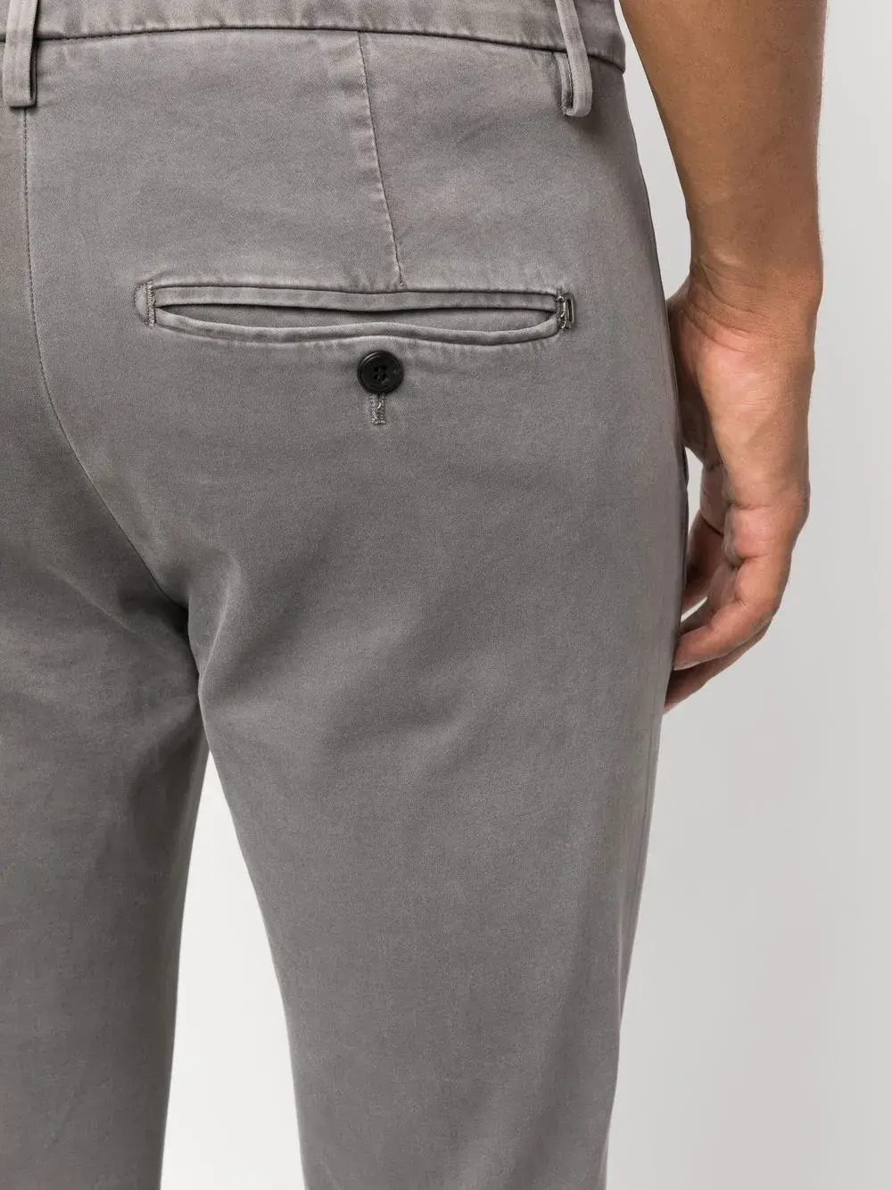 Серый, эластичный хлопок, петли для ремня, застежка на пуговицах спереди, два кармана по бокам, два кармана с листочкой сзади и облегающий крой.
