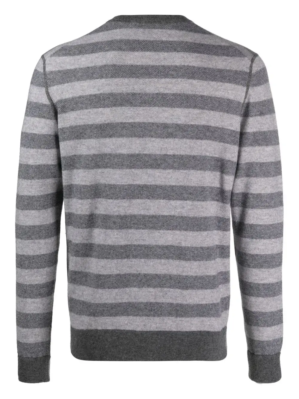 Серый, смесь шерсти и кашемира, сочетание двух оттенков, принт в горизонтальную полоску, тонкая вязка, круглый вырез и длинные рукава.