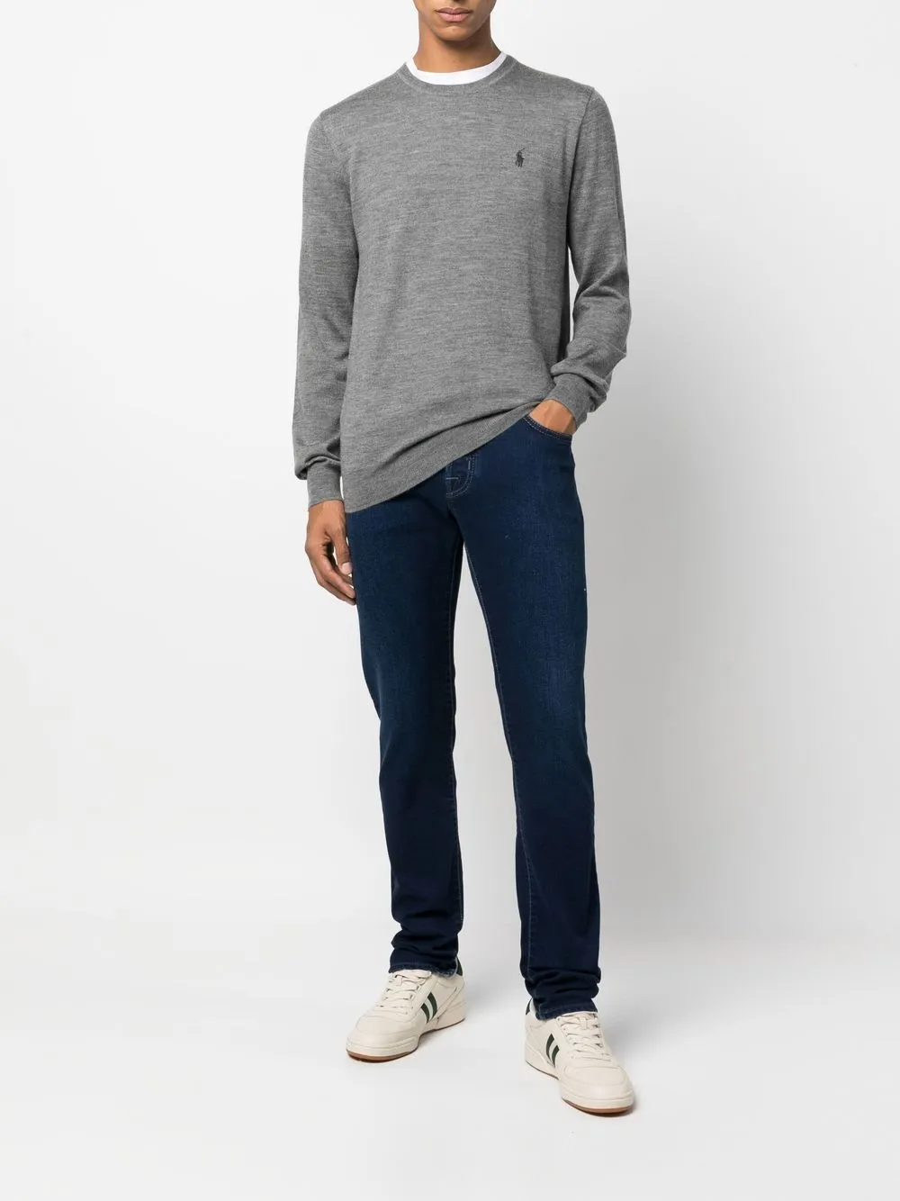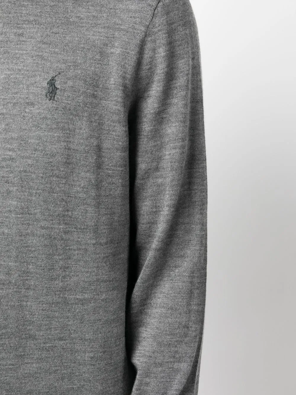 Светло-серый, шерсть, тонкая вязка, знаковый логотип Polo Pony, вышитый логотип, круглый вырез, длинные рукава и прямой подол.