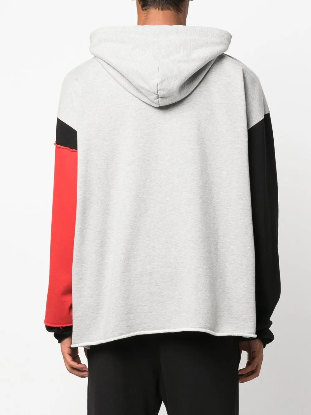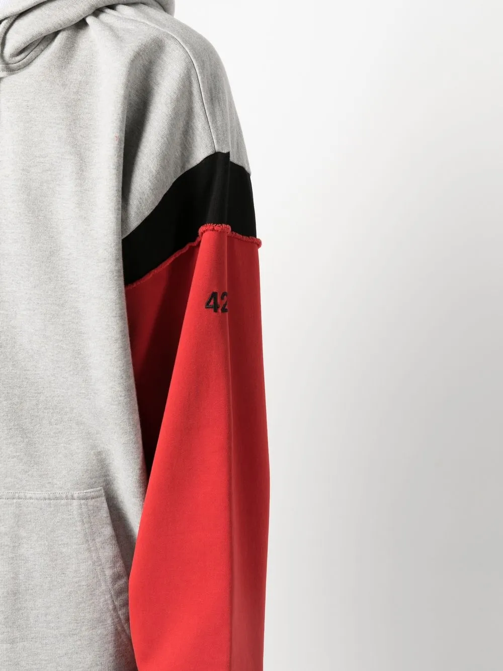 Светло-серый, ярко-красный, черный, хлопок, дизайн колор-блок, логотип на дужке, затягивающийся на шнурок капюшон, приспущенные плечи, длинные рукава и карман-муфта.