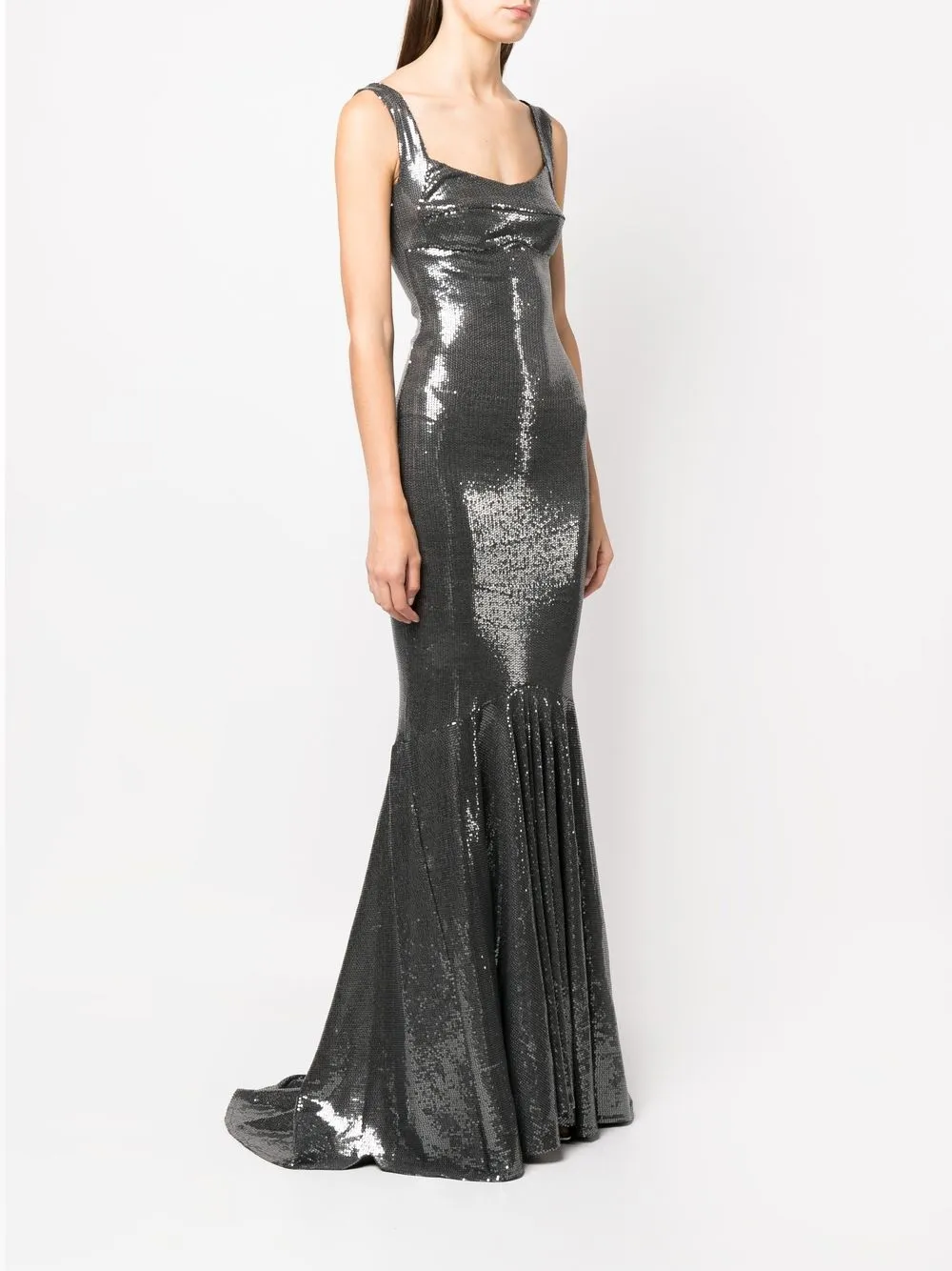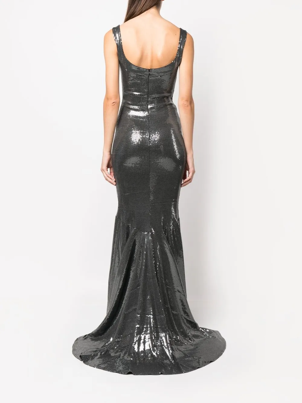 Антрацитово-серый, украшение из пайеток, без рукавов, вырез в форме сердца, U-образный вырез на спине, потайная застежка на молнии сзади, длина макси и шлейф.