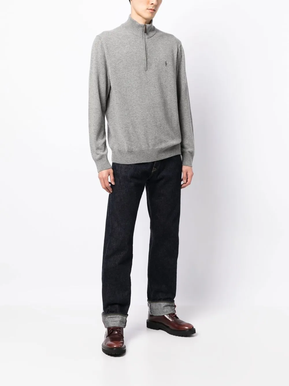 Серый, шерсть, тонкая вязка, знаковый логотип Polo Pony, застежка на молнии спереди, высокий воротник, длинные рукава и прямой подол.
