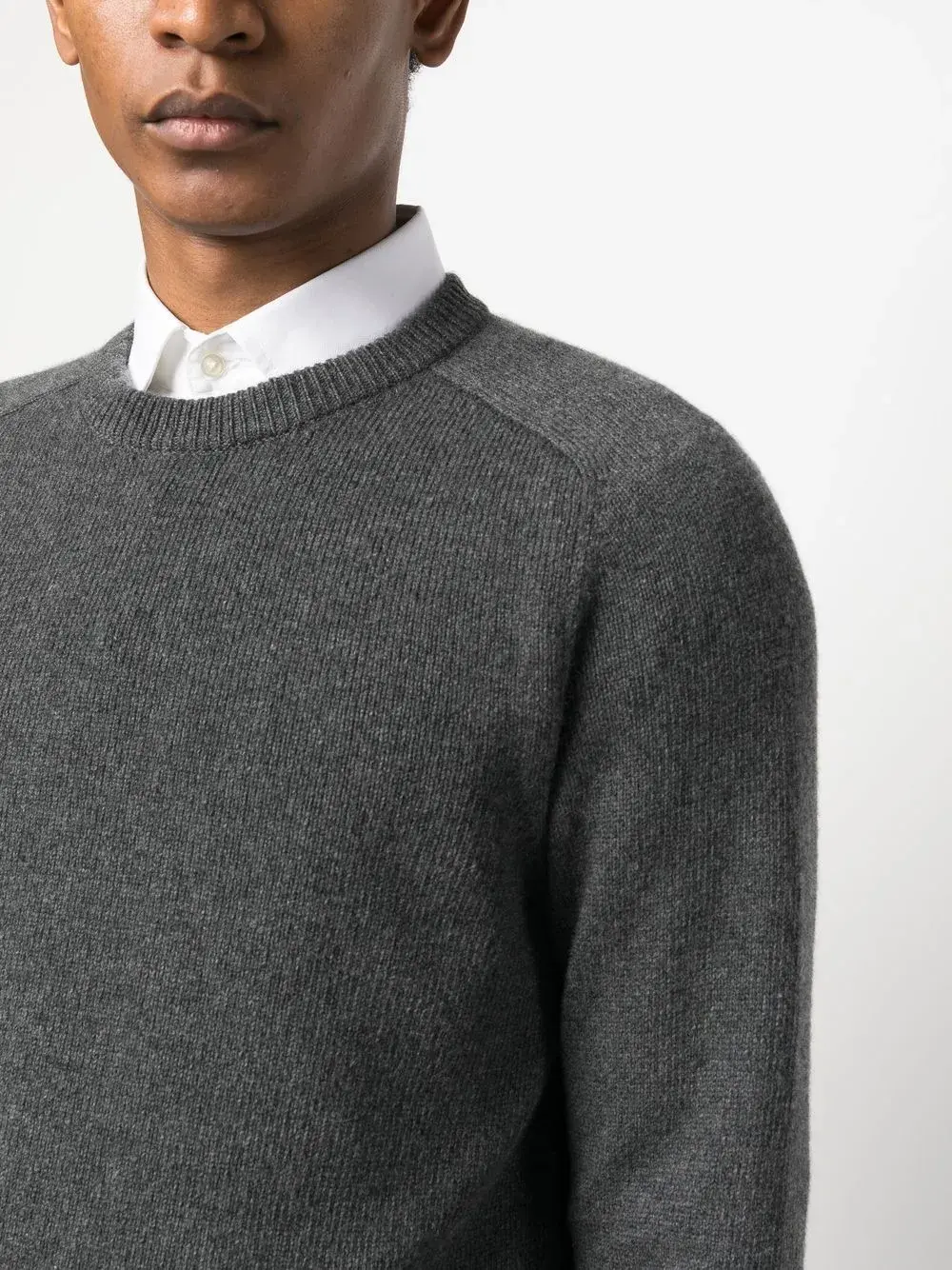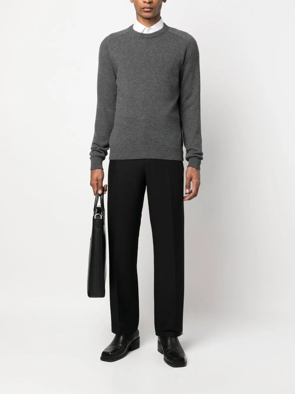 Серый бетон, кашемир, трикотажный материал, круглый вырез, длинные рукава, отделка в рубчик и прямой подол.