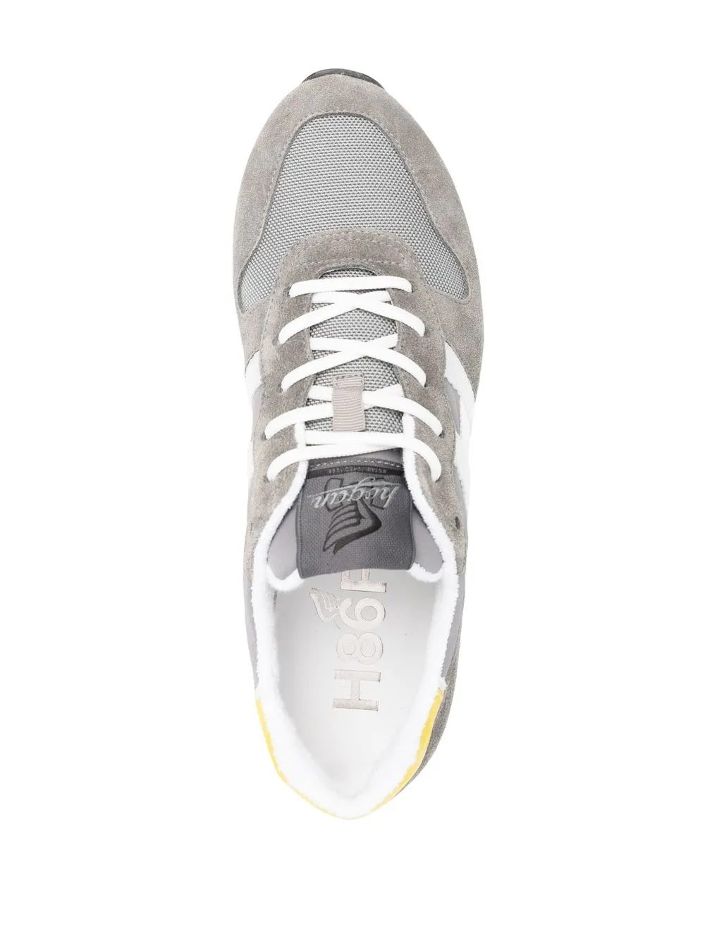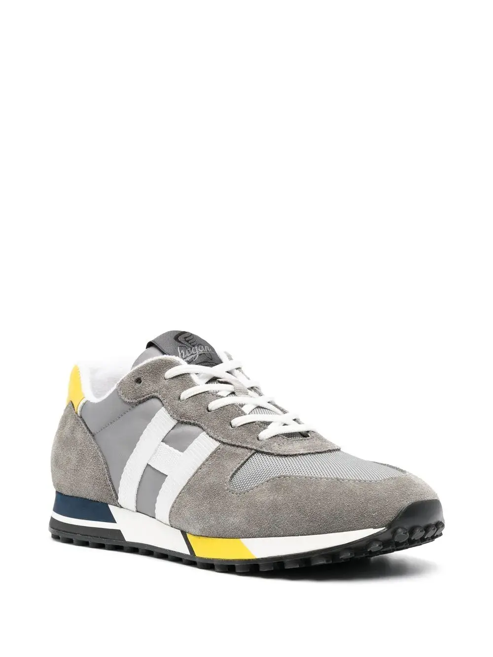 Пепельно-серый, желтый, замша из телячьей кожи, телячья кожа, вставки, контрастный задник с логотипом, шнуровка спереди, закругленный носок и плоская резиновая подошва.