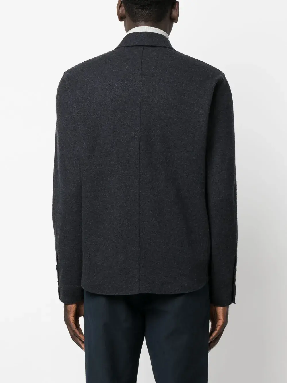 Антрацитово-серый, необработанная шерсть, фетровый материал, пуговицы с тисненым логотипом, плоский заостренный воротник, потайная пуговичная застежка спереди, длинные рукава, манжеты на пуговицах, два накладных кармана на груди, два прорезных кармана по бокам и закругленный подол.