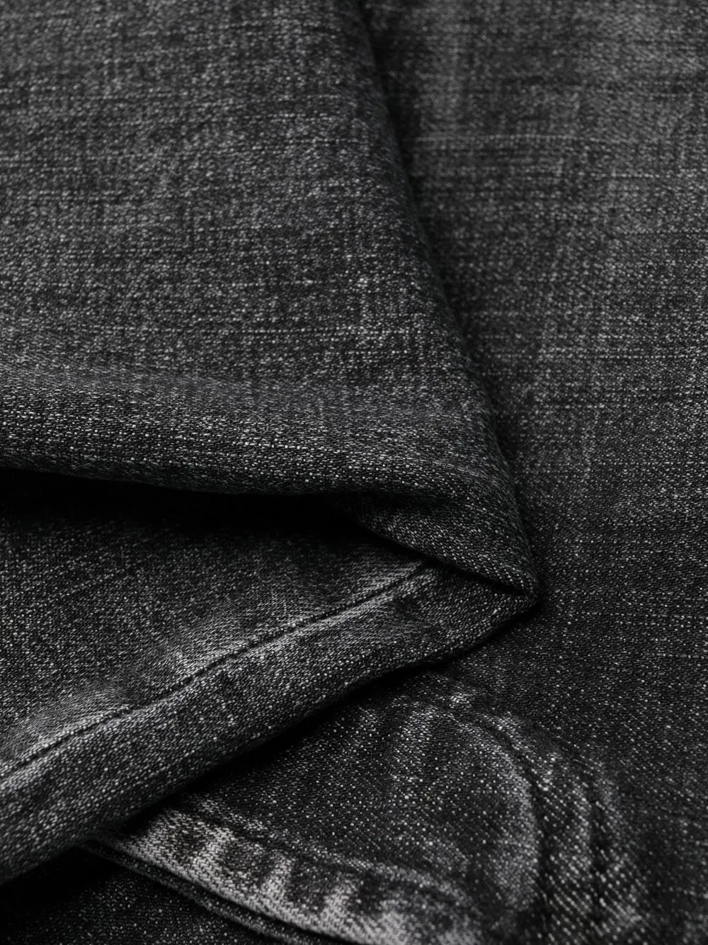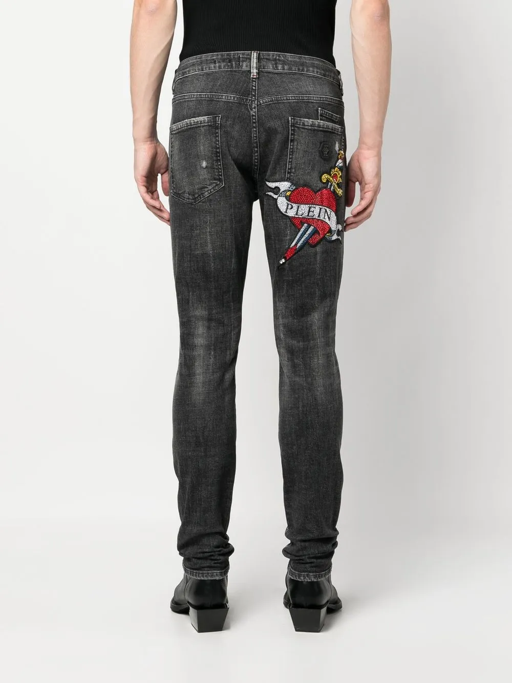 Темно-серый, смесовый хлопок, темный оттенок денима, модель с прорезями, принт с логотипом сзади, декор из кристаллов, пять карманов, застежка на молнии и пуговице спереди, петли для ремня и прямой крой.