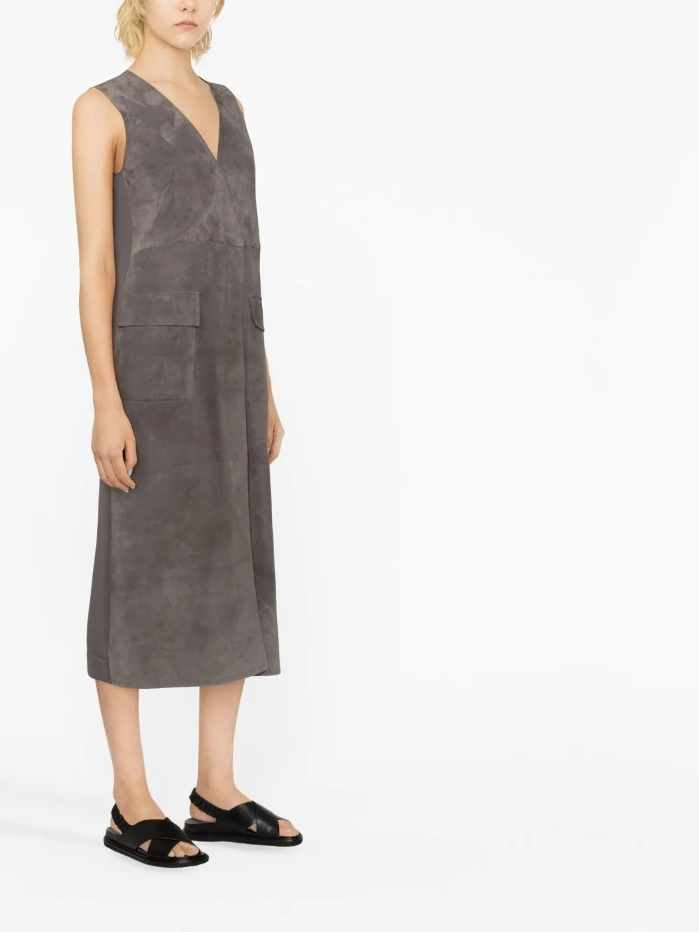 Серый, телячья кожа, хлопок, V-образный вырез, без рукавов, модель на запах, ремень на талии, два передних кармана с клапанами и длина миди.