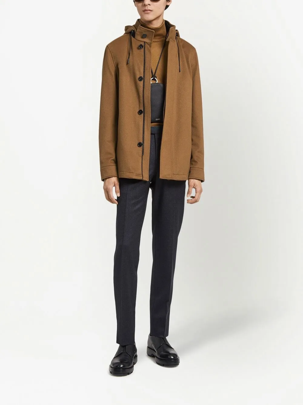 Темно-серый, шерсть, смещенная застежка на пуговицах спереди, потайная молния спереди, петли для ремня, два прорезных кармана по бокам и зауженный крой.