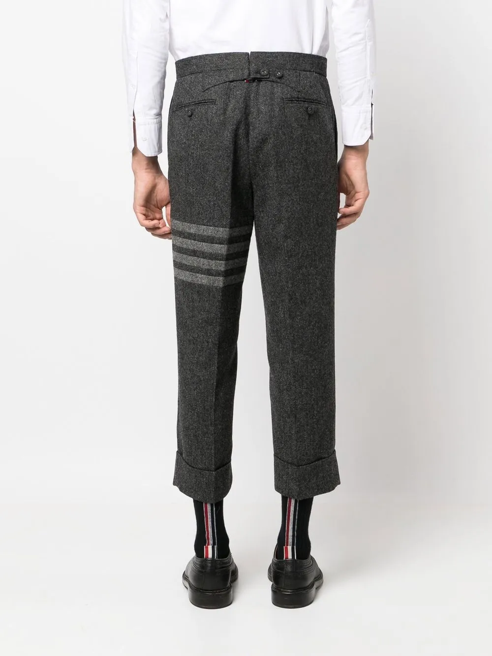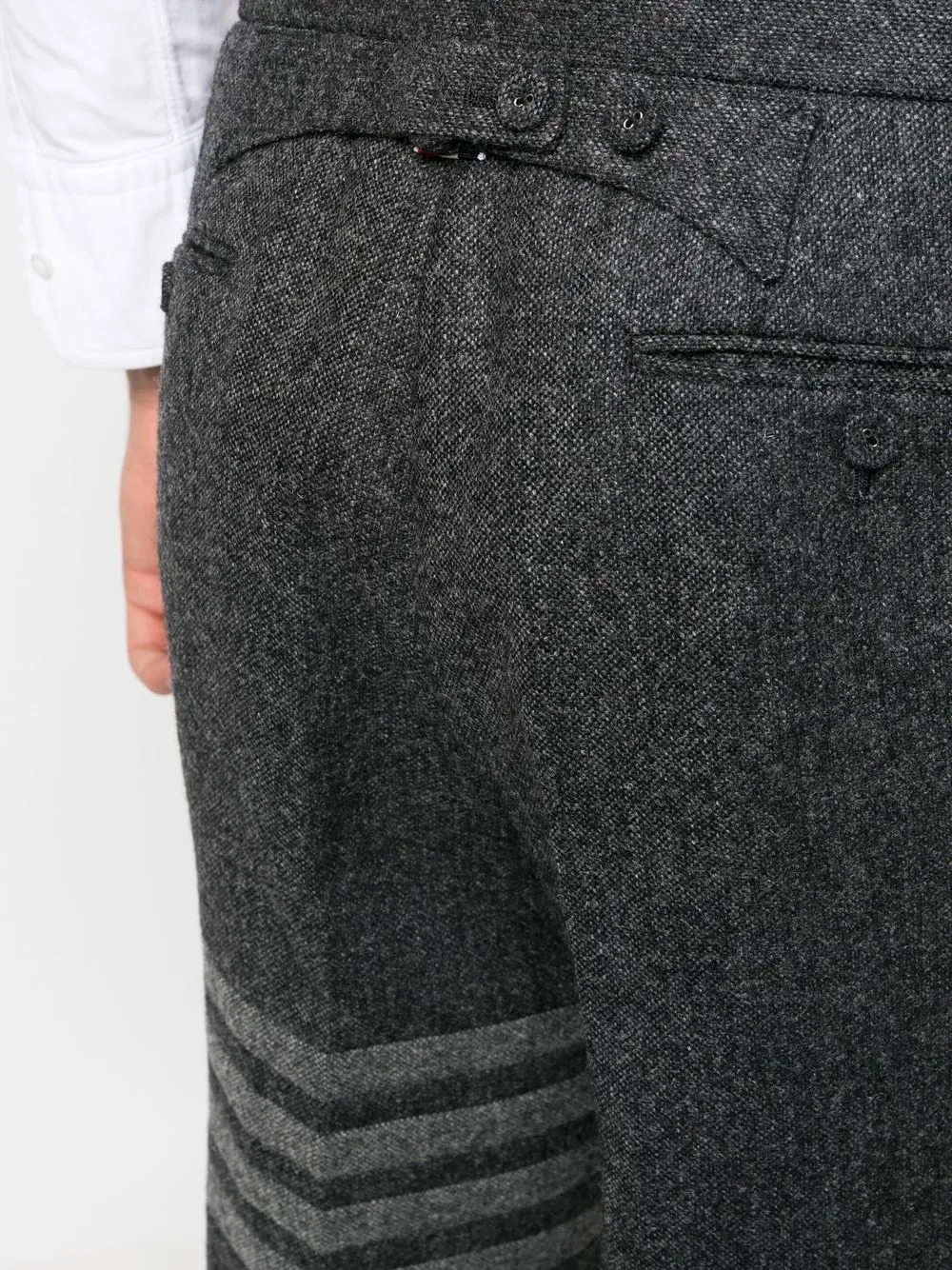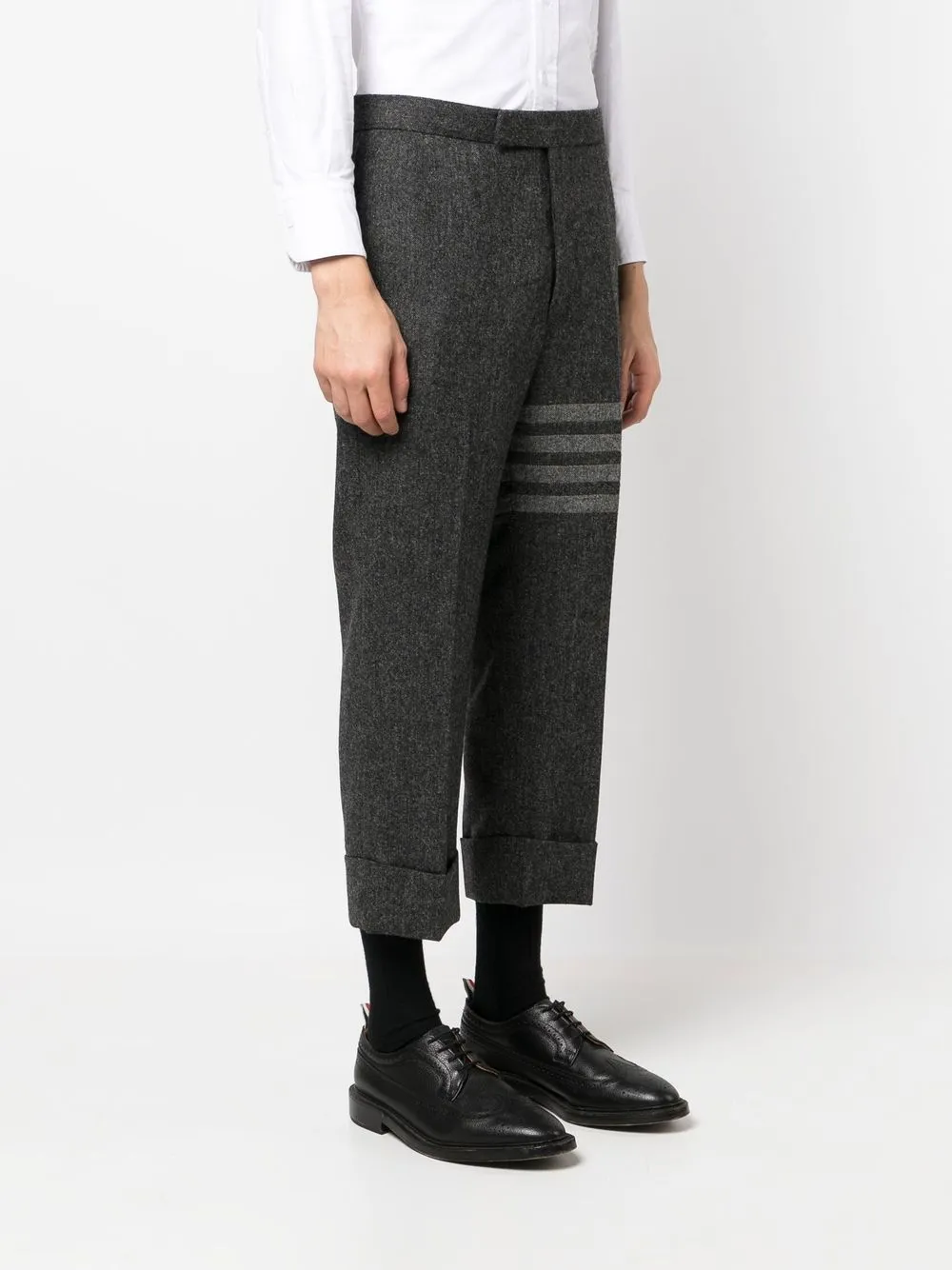 Серый, твидовая ткань, полоски 4-Bar, низкий шаговый шов, застежка на молнии и пуговице спереди и укороченная длина.