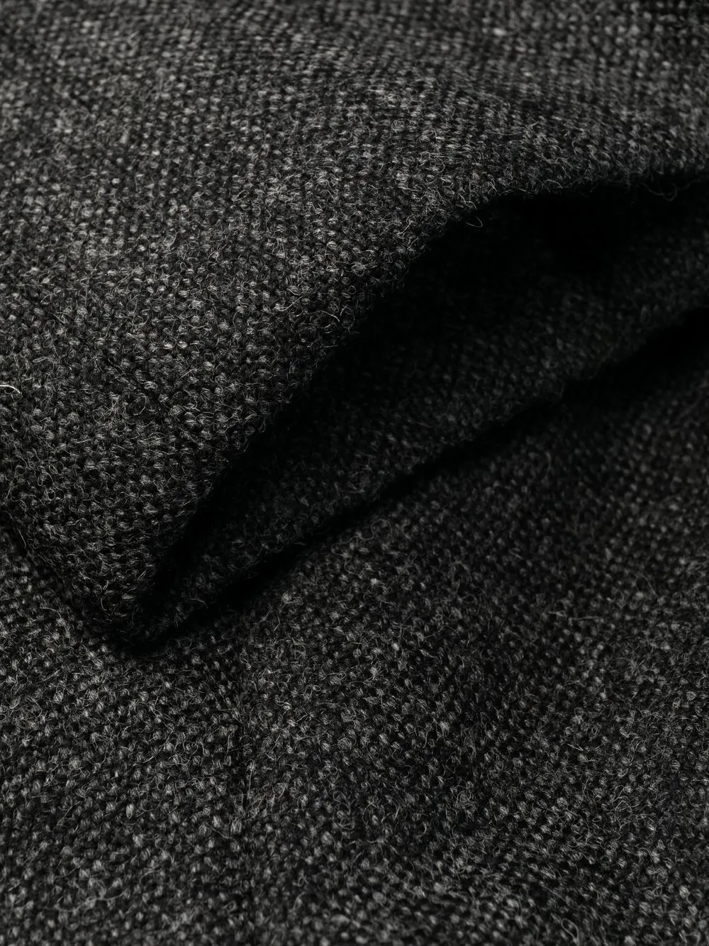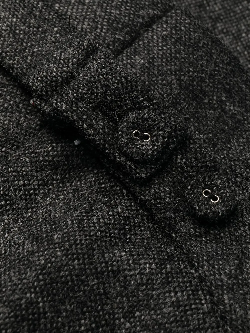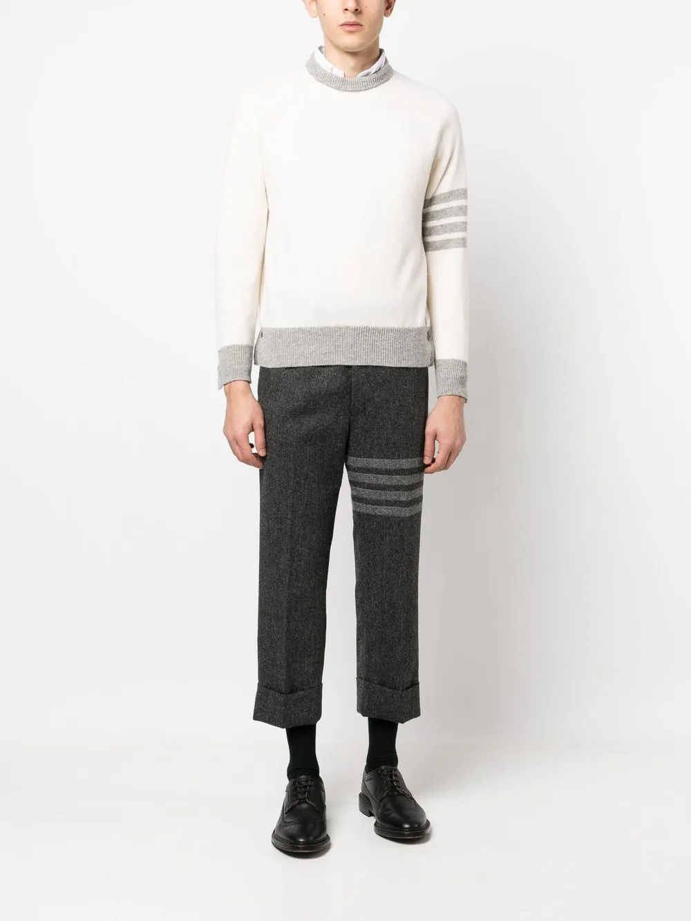 Серый, твидовая ткань, полоски 4-Bar, низкий шаговый шов, застежка на молнии и пуговице спереди и укороченная длина.