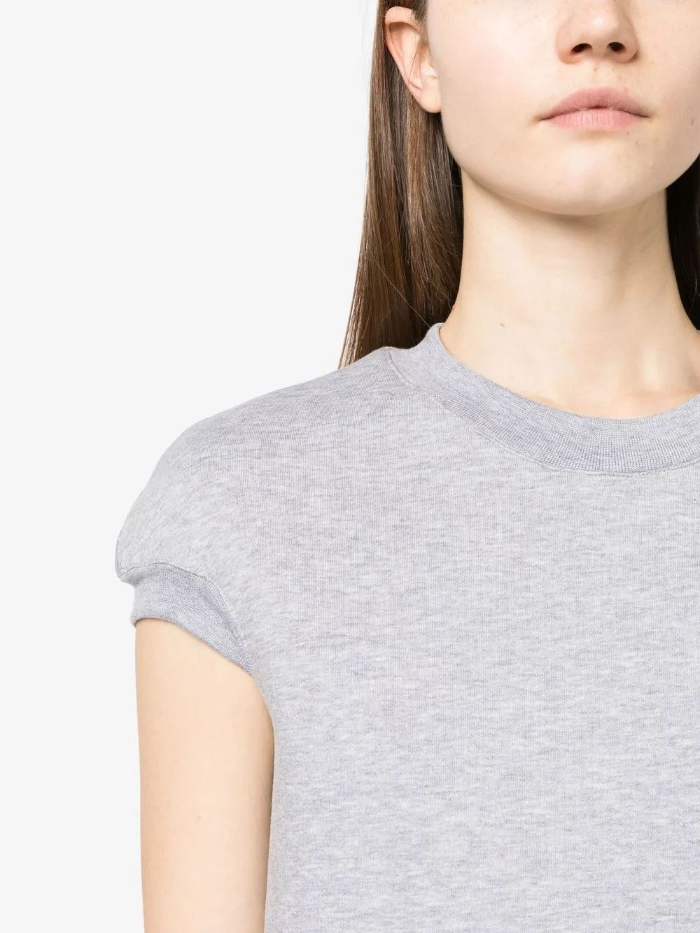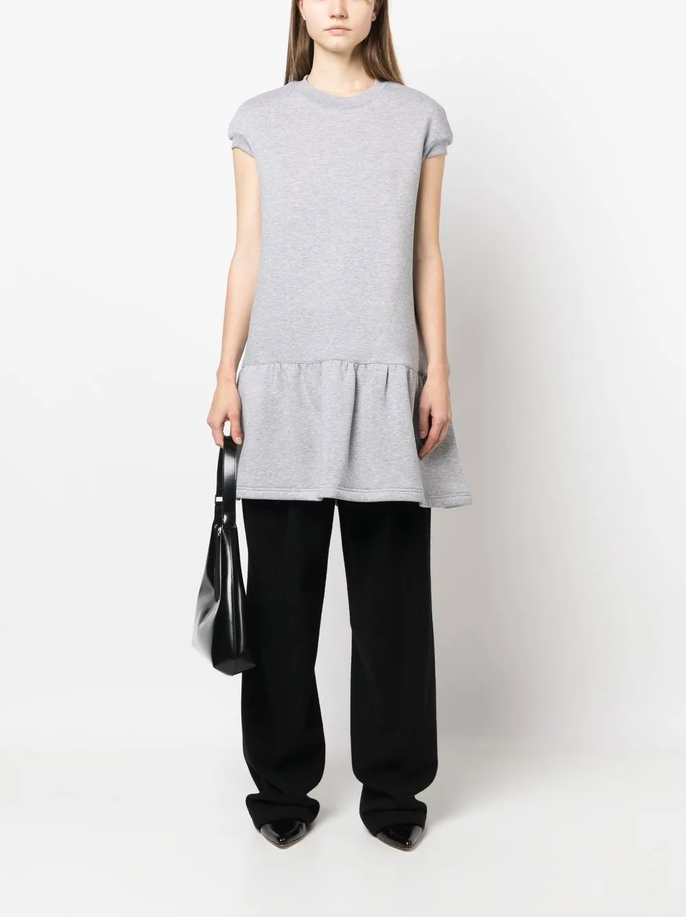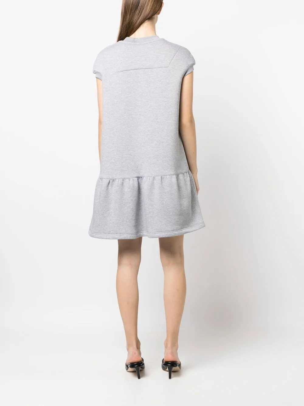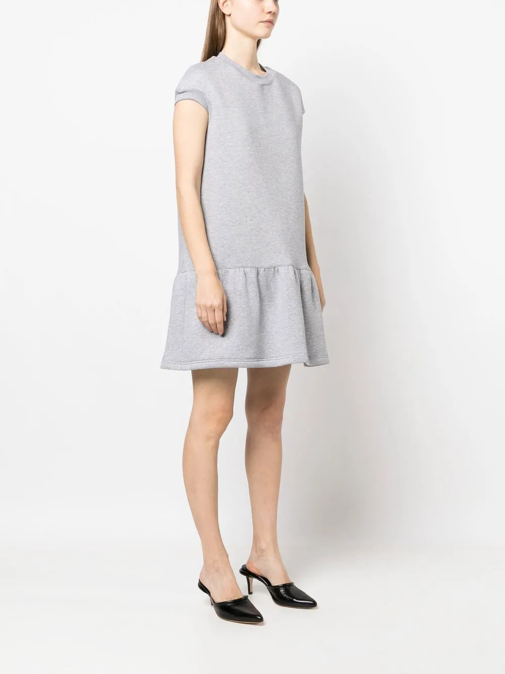 Светло-серый, круглый вырез, короткие рукава и расклешенный подол.