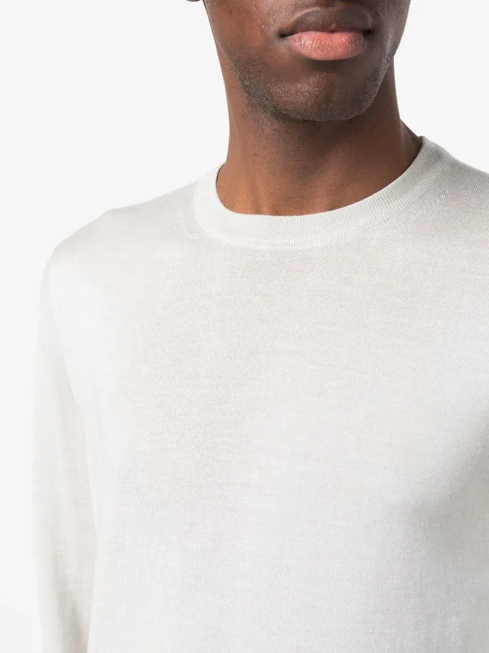 Светло-серый, смесь кашемира и шелка, трикотажный материал и круглый вырез.