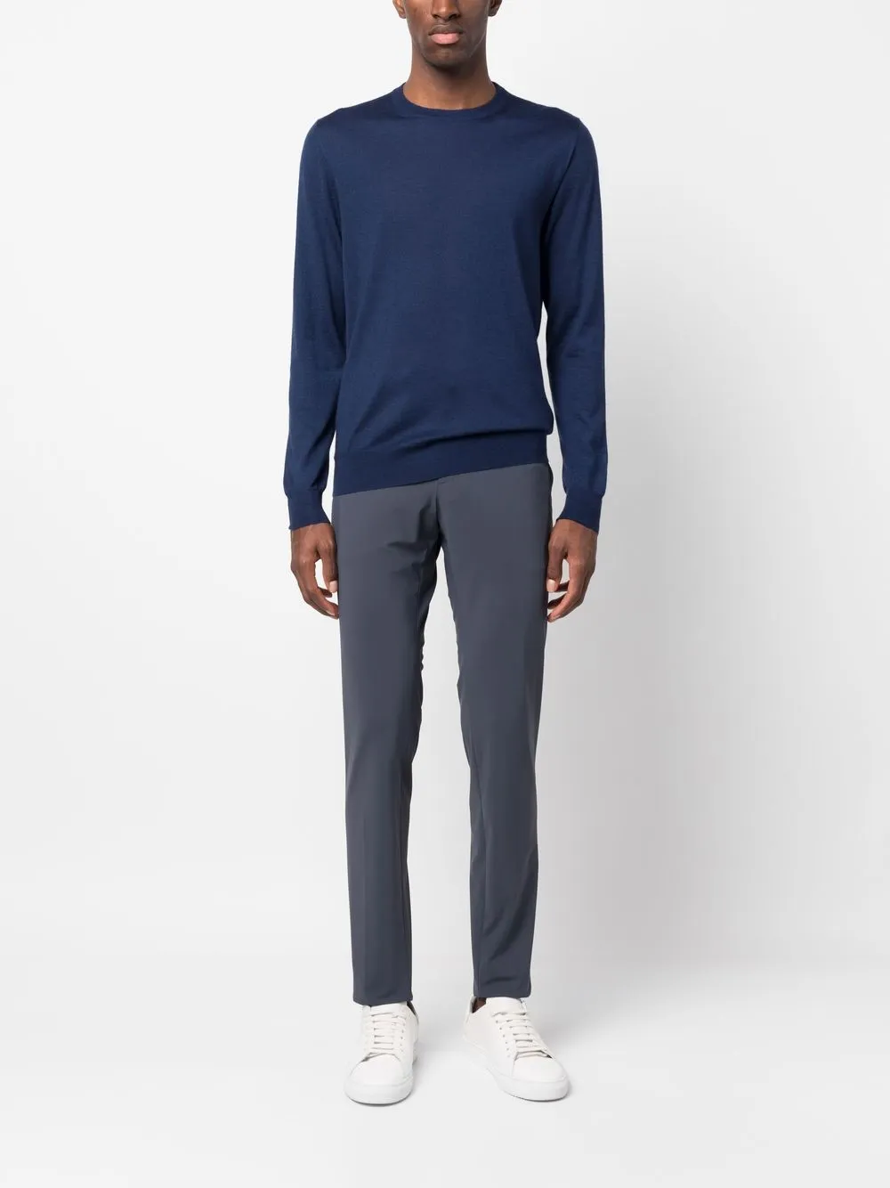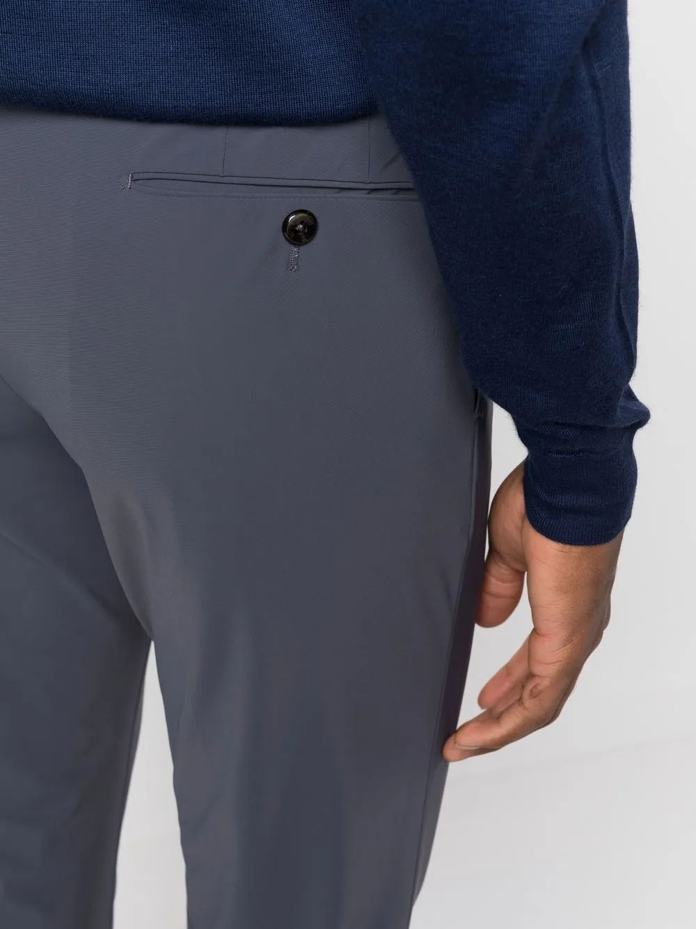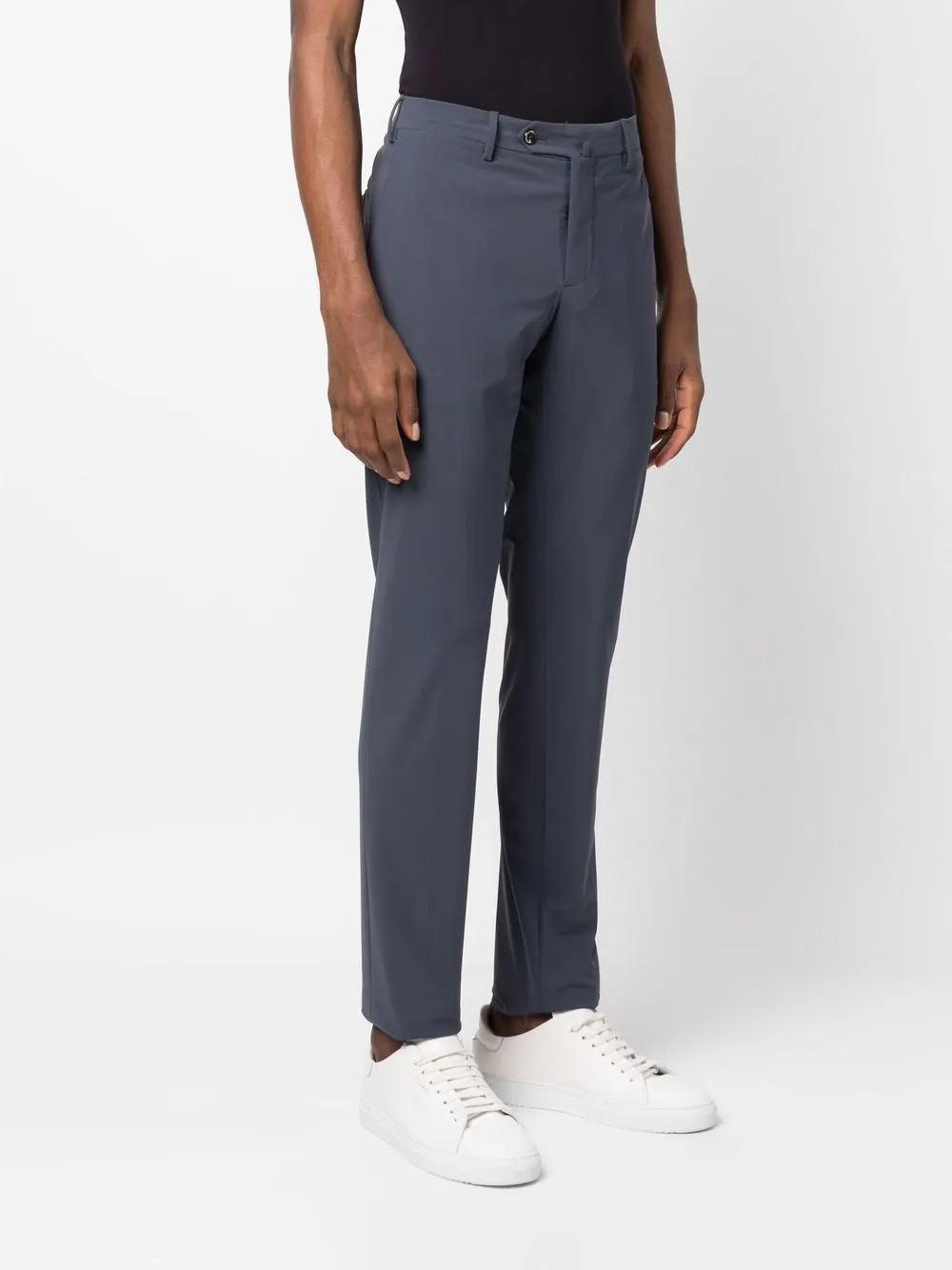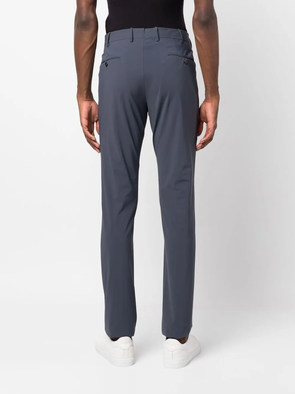 Петли для ремня, застежка на молнии и пуговице спереди, два вшитых кармана по бокам, два прорезных кармана на пуговицах сзади и узкий крой.
