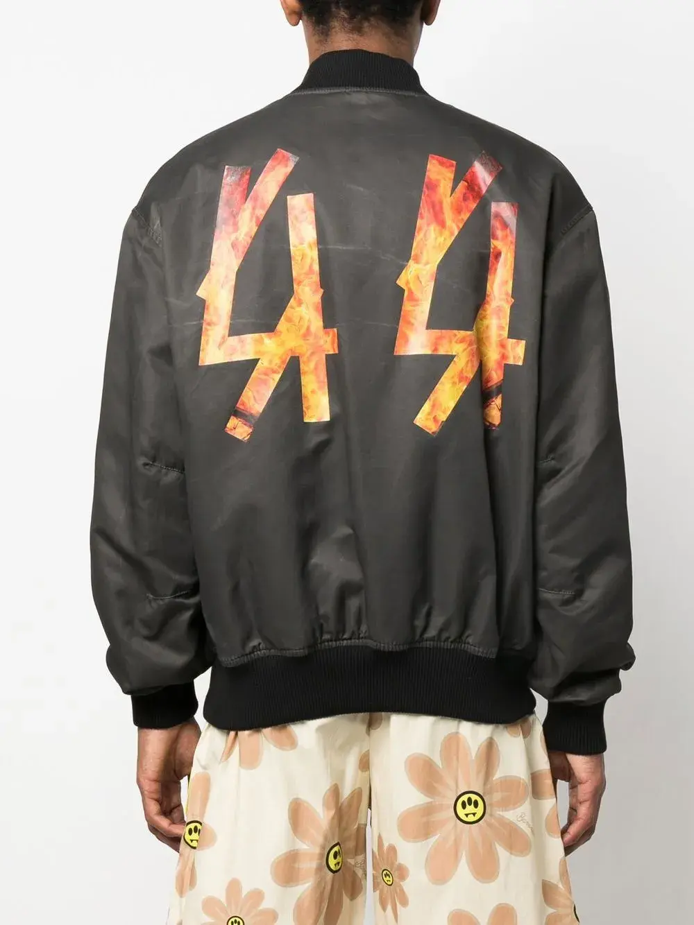 Серый, воротник-стойка в рубчик, застежка на молнии спереди, два кармана с клапанами по бокам, приспущенные плечи, длинные рукава, принт с логотипом сзади, принт с изображением пламени и маленькая подвеска с логотипом.