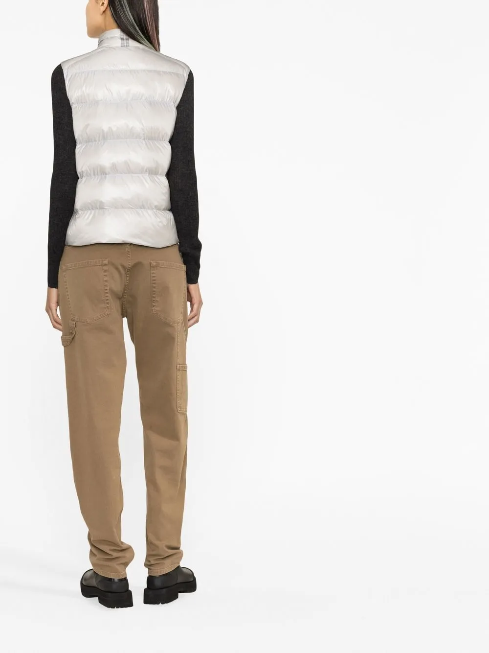 Серебристый, дутый материал, наполнитель из смеси пуха и пера, нашивка с логотипом на груди, двусторонняя молния спереди, высокий воротник, два прорезных кармана сбоку, без рукавов и прямой подол.