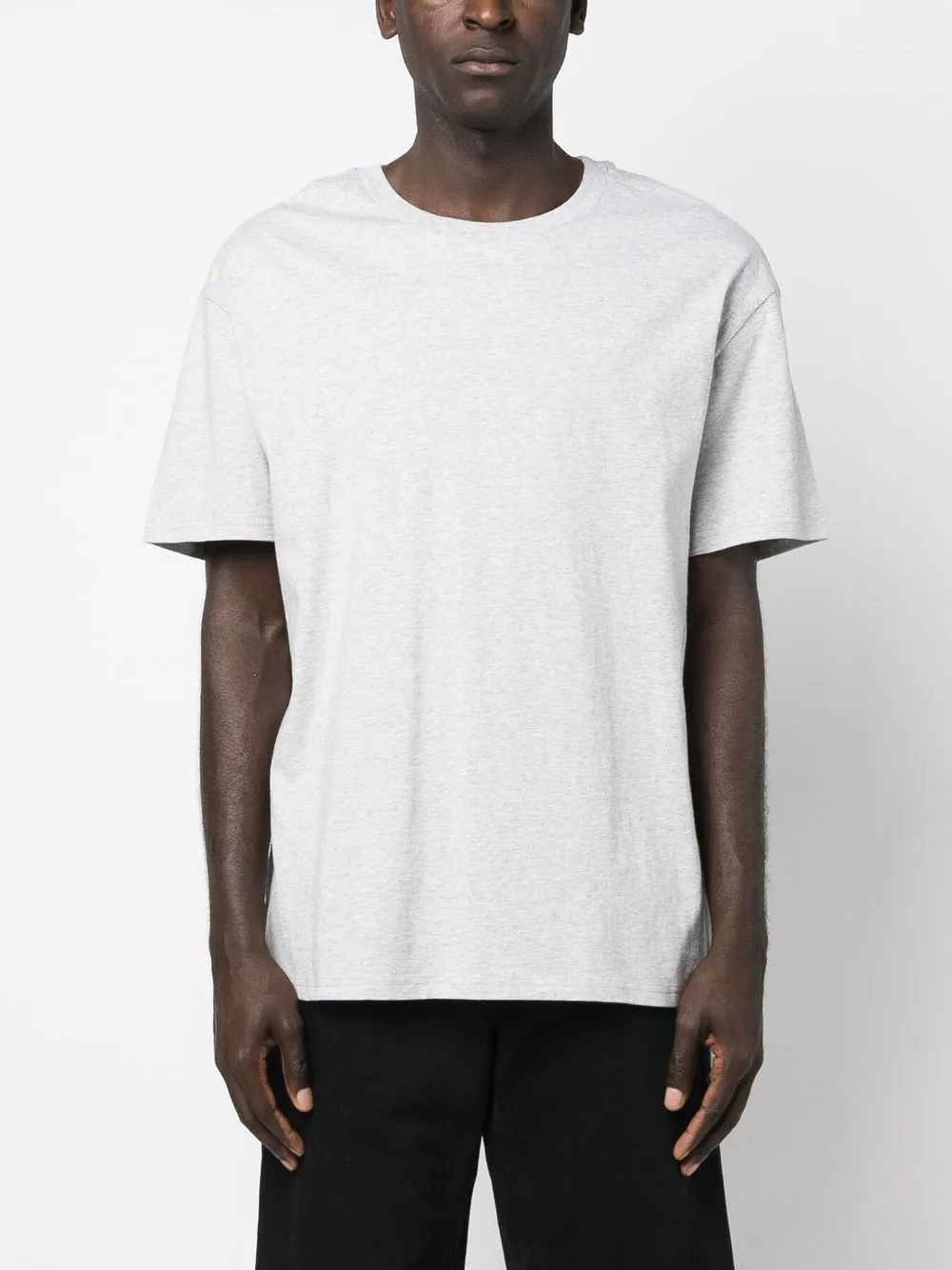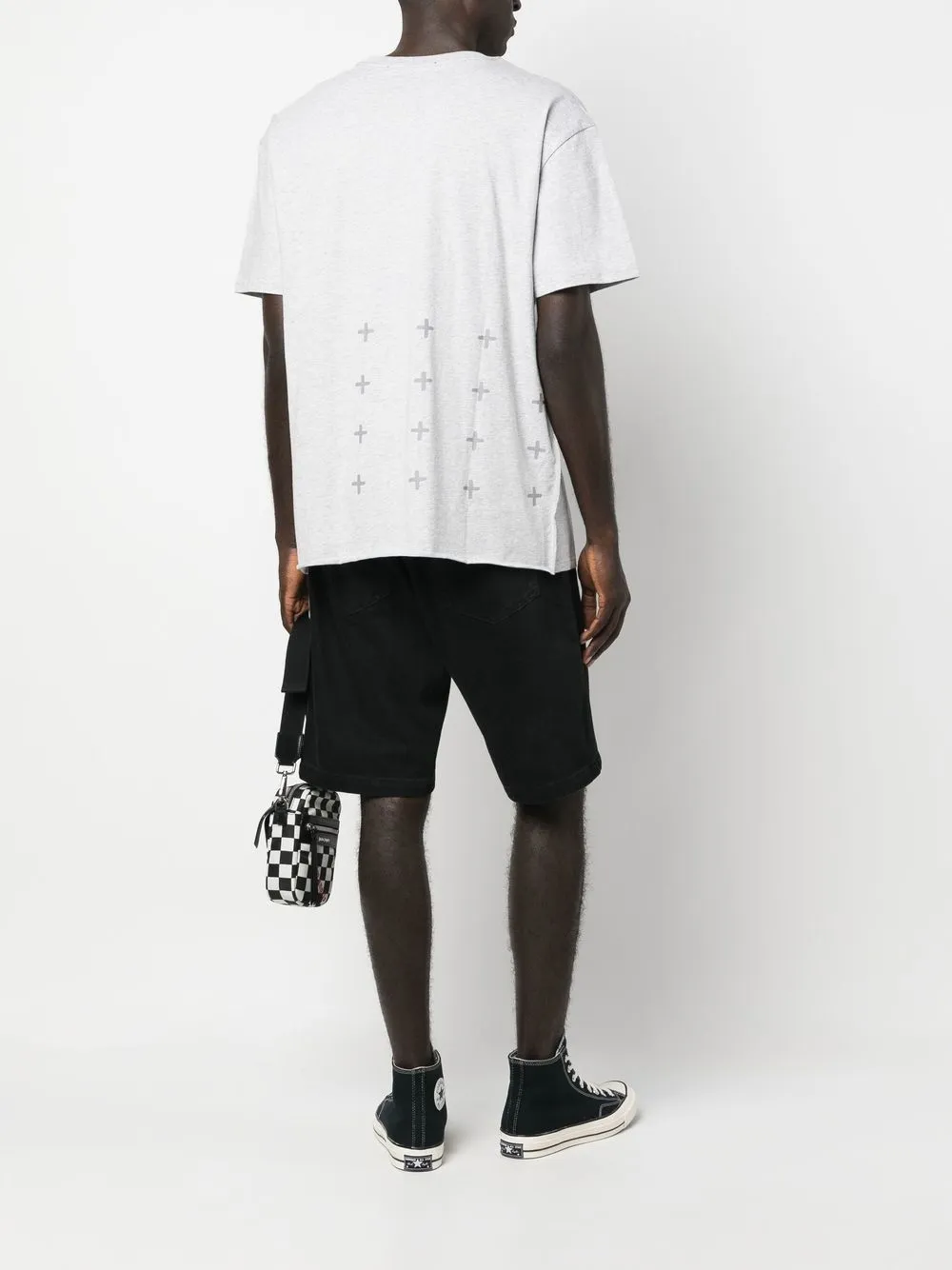 Светло-серый, хлопок, графичный принт на спине, круглый вырез, короткие рукава и прямой подол.