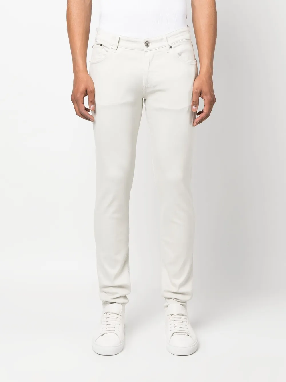 Кремово-белый, хлопок, деним, пять карманов, петли для ремня, застежка на молнии и пуговице спереди и узкий крой.
