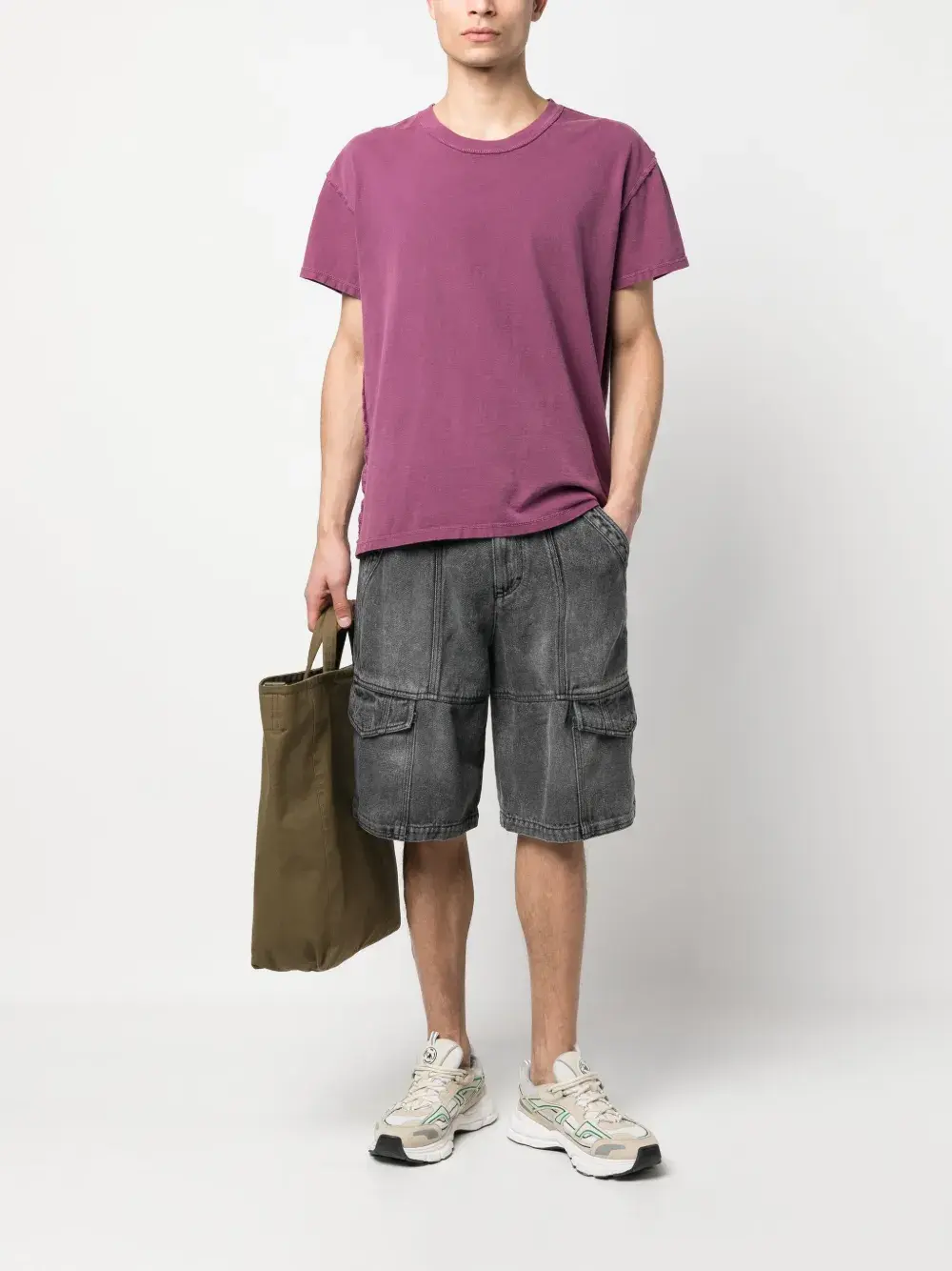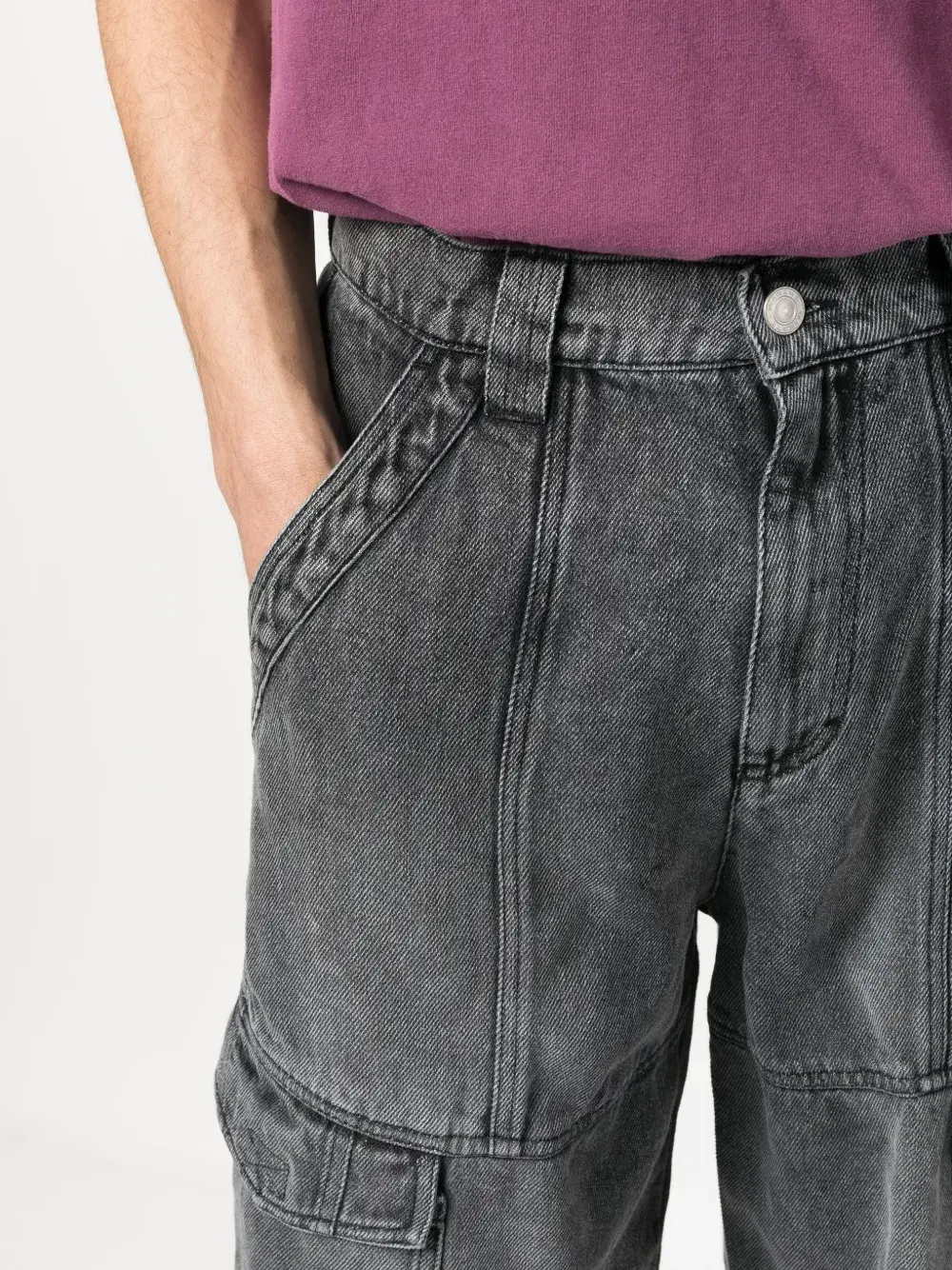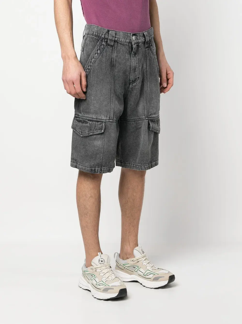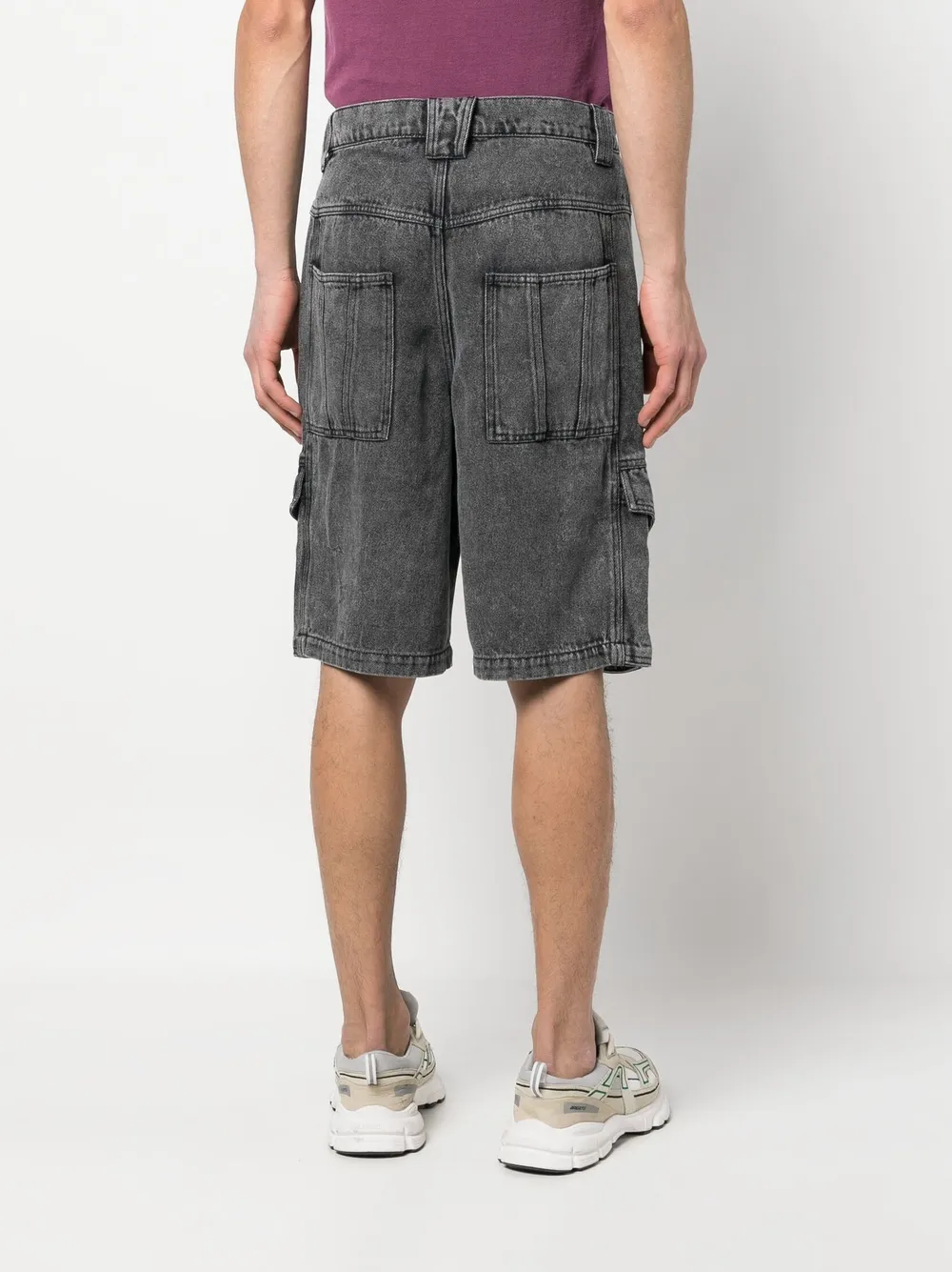 Угольно-серый, хлопок, TENCEL, петли для ремня, застежка на молнии и пуговице спереди, два передних кармана с клапанами, два кармана по бокам, два накладных кармана сзади и длина по колено.