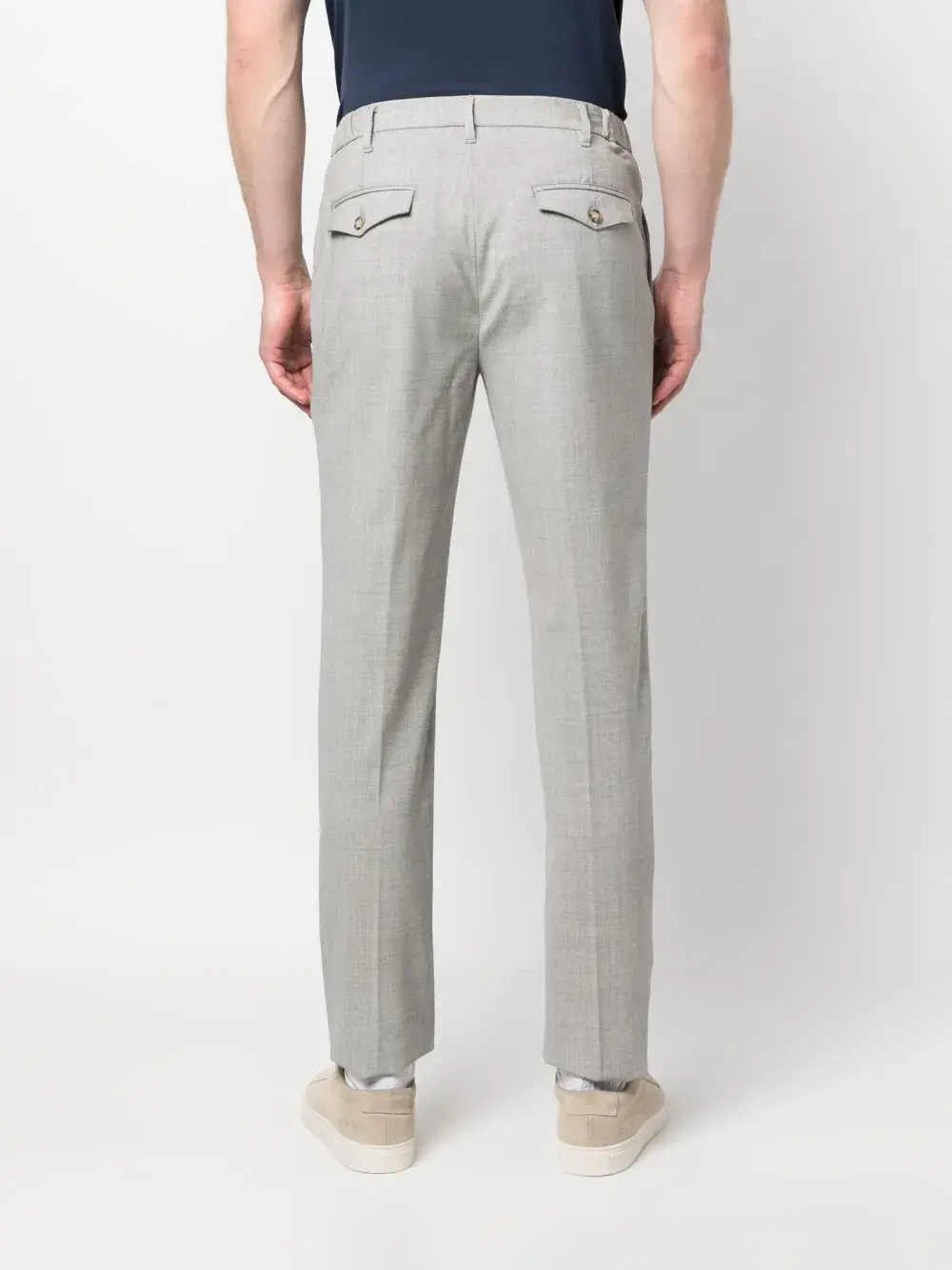 Светло-серый, смесовая необработанная шерсть, петли для ремня, застежка на молнии и пуговице спереди, зауженный крой, два прорезных кармана по бокам и два кармана с клапанами сзади.