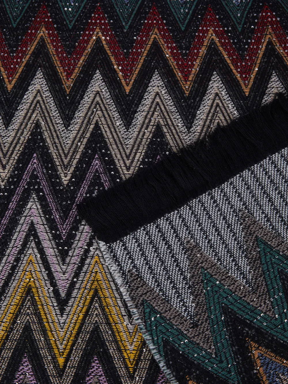 Разноцветный, смесовая шерсть, трикотажный материал, плетение с узором зигзаг и украшение из пайеток.