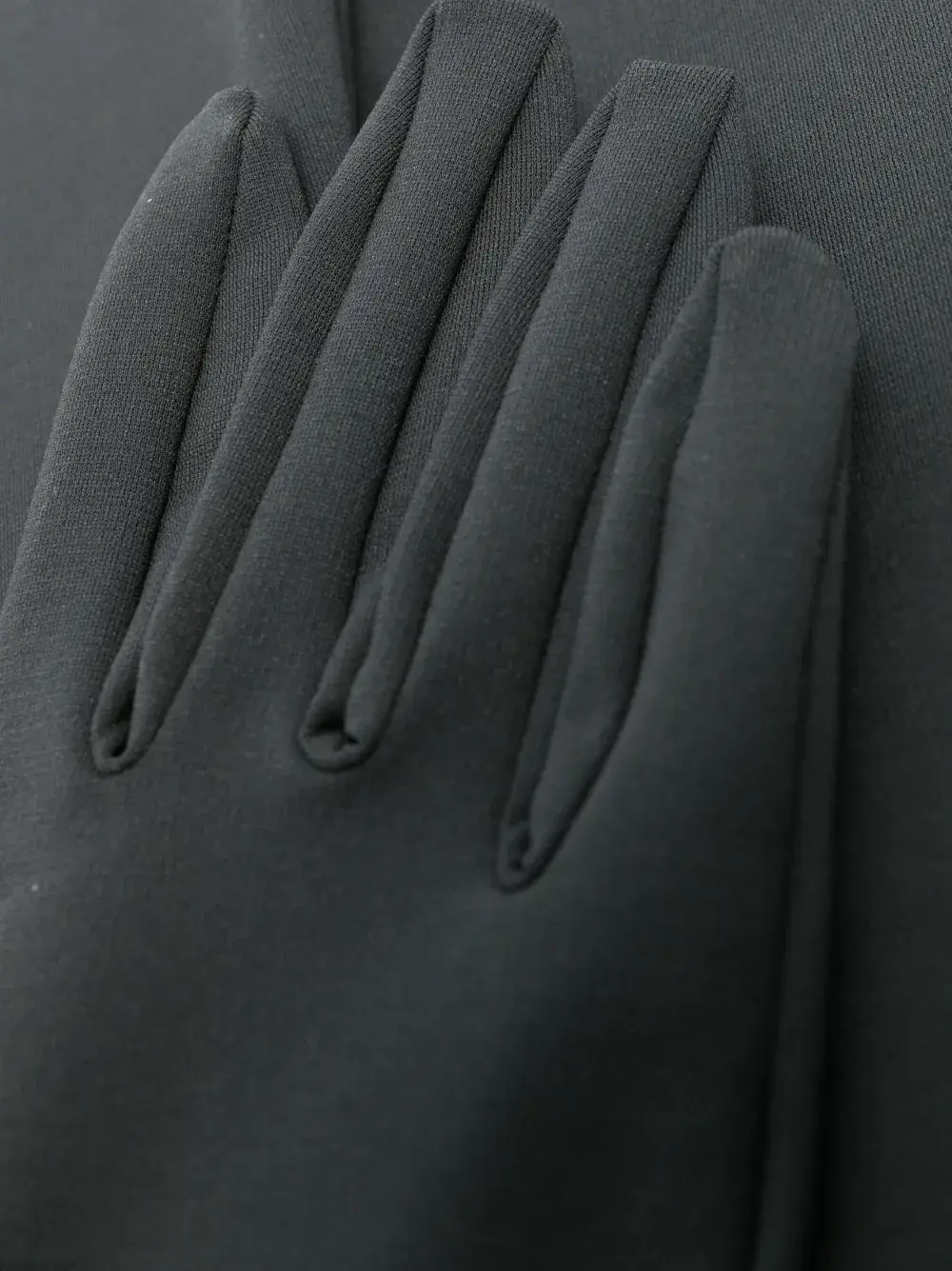 Темно-серый, эластичный материал, кольцо на всю фалангу и длина до локтя.