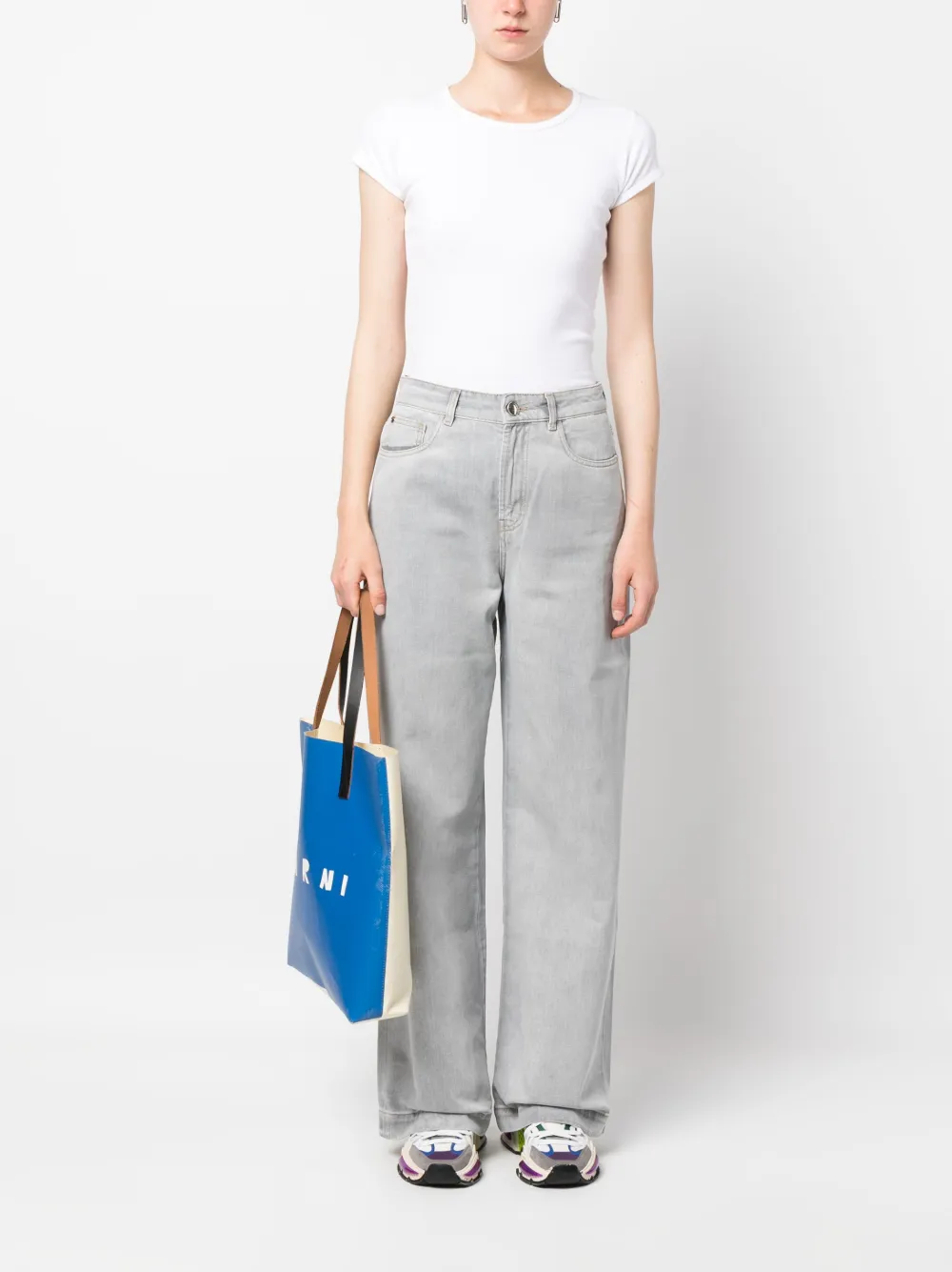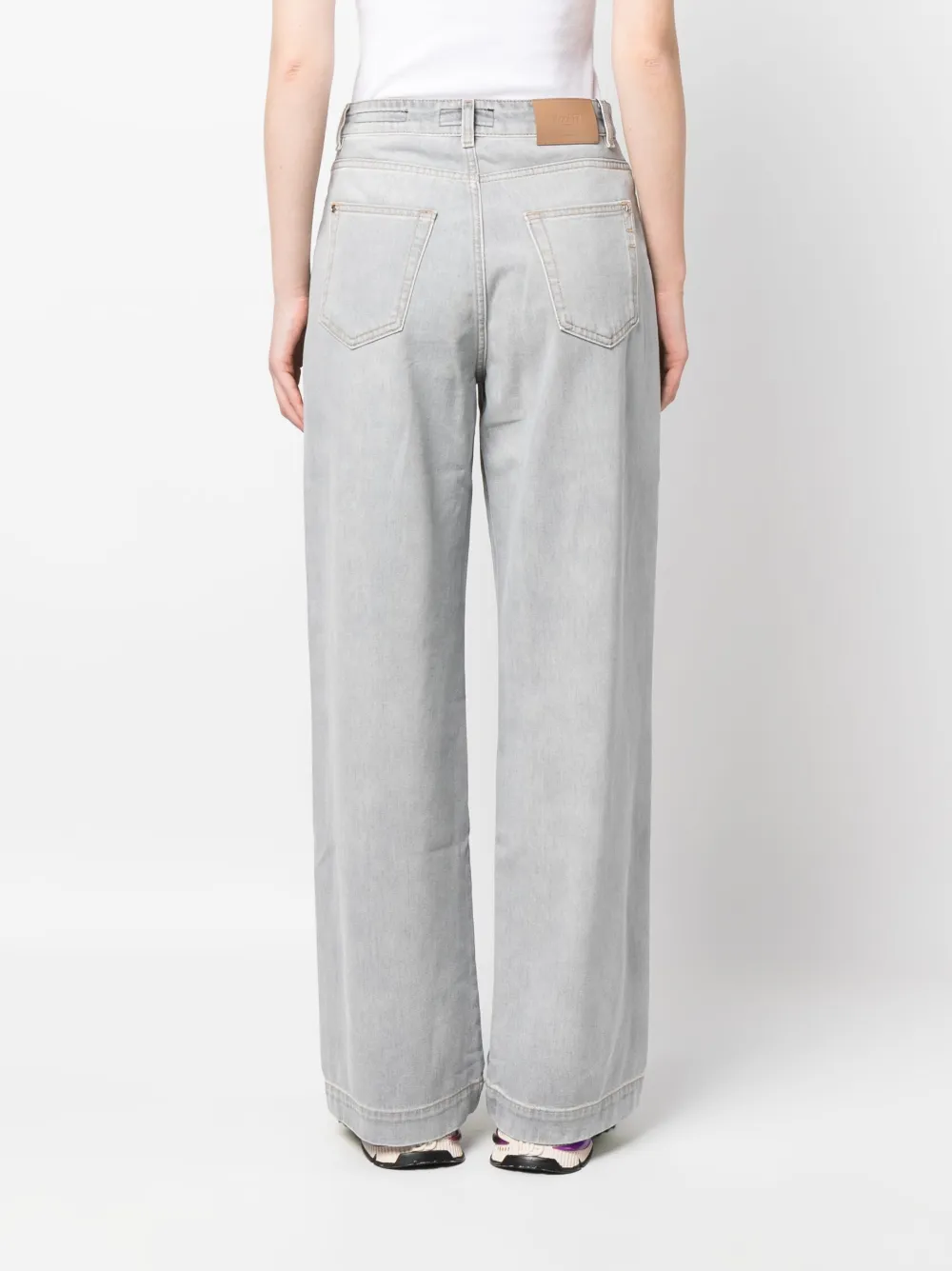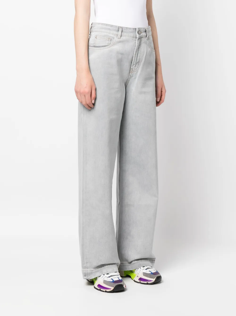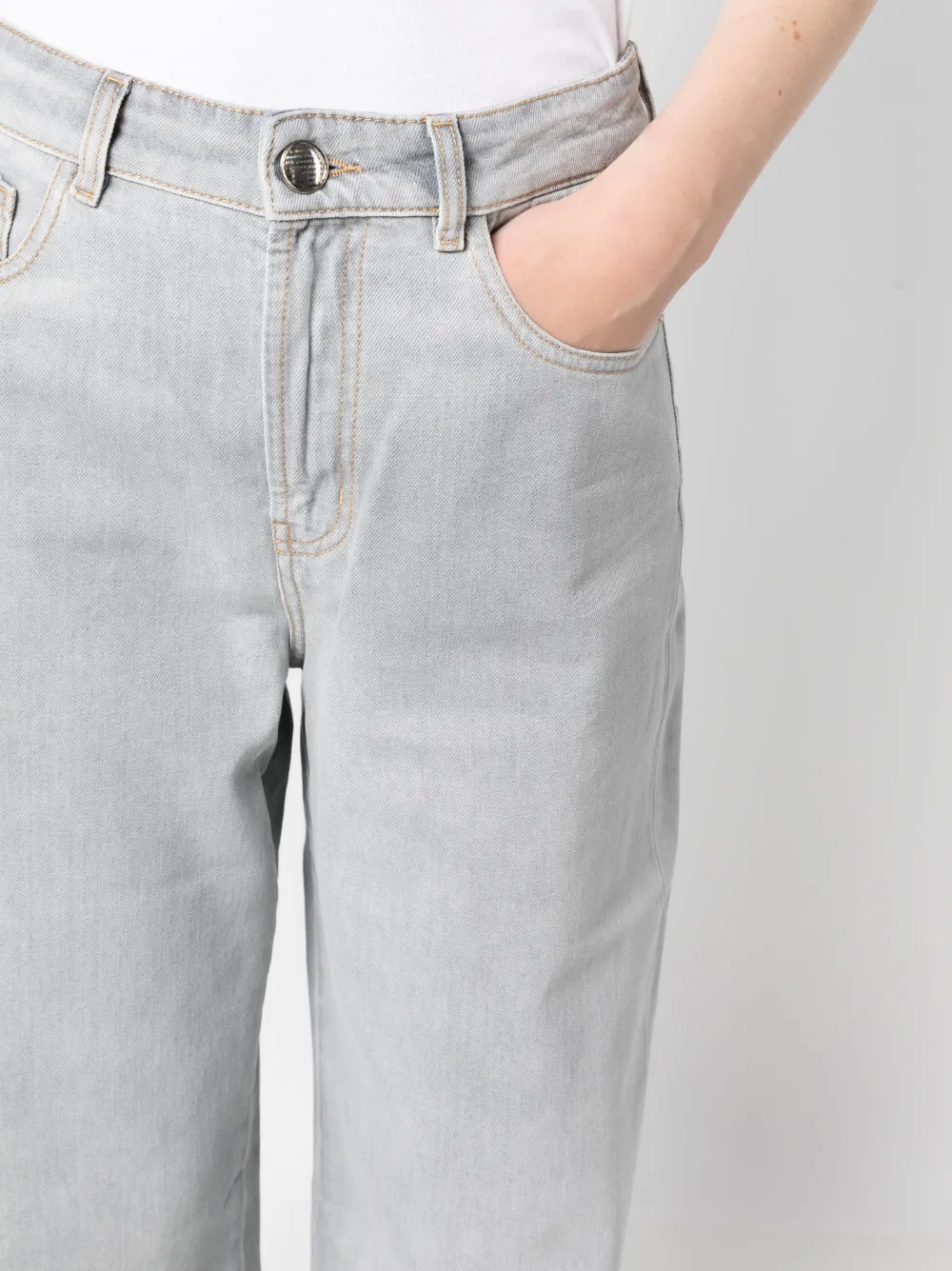 Светло-серый, хлопок, деним, контрастная строчка, нашивка с логотипом сзади, прямой крой, средняя посадка, потайная застежка на молнии и пуговицах, петли для ремня и пять карманов.
