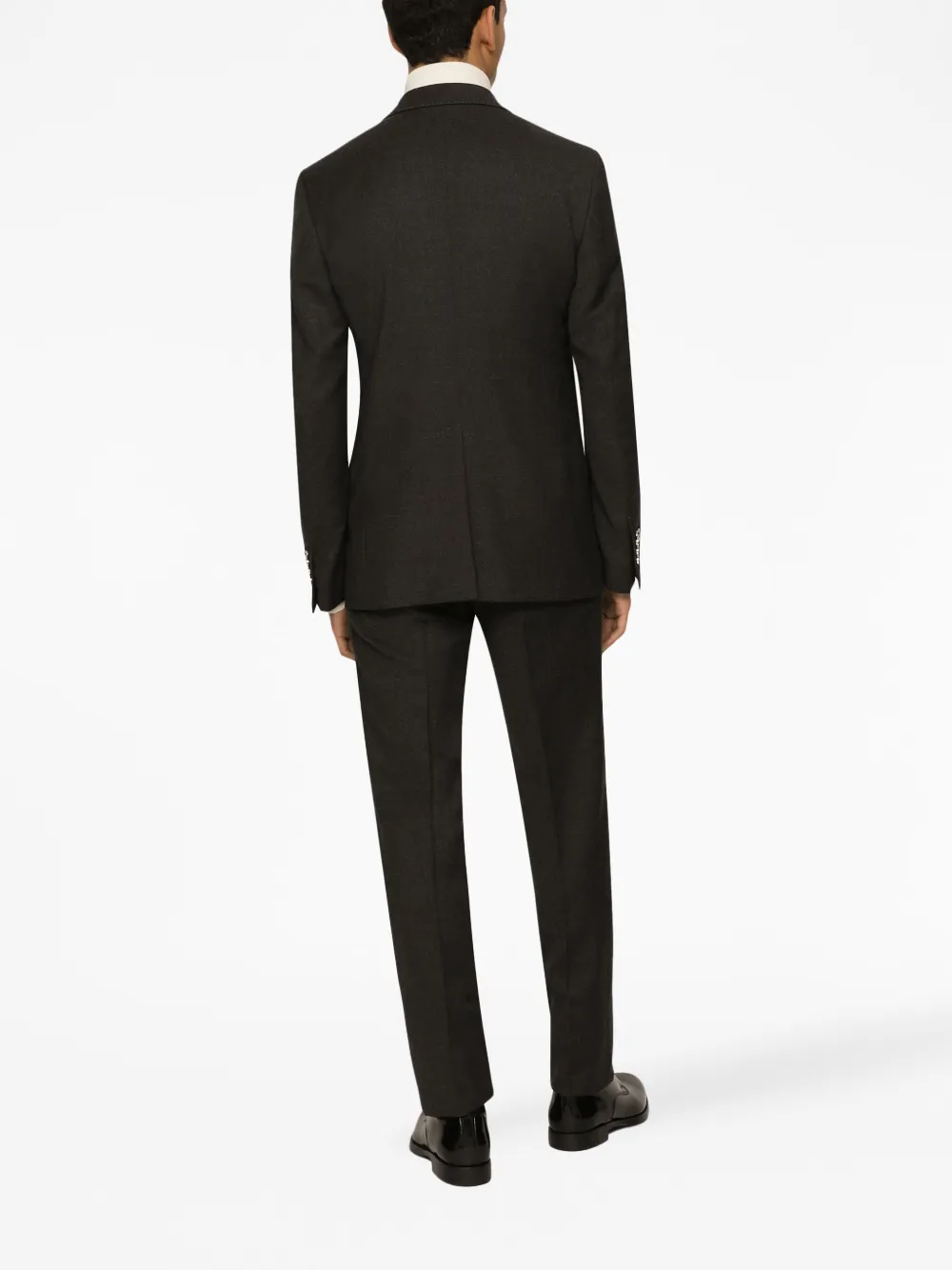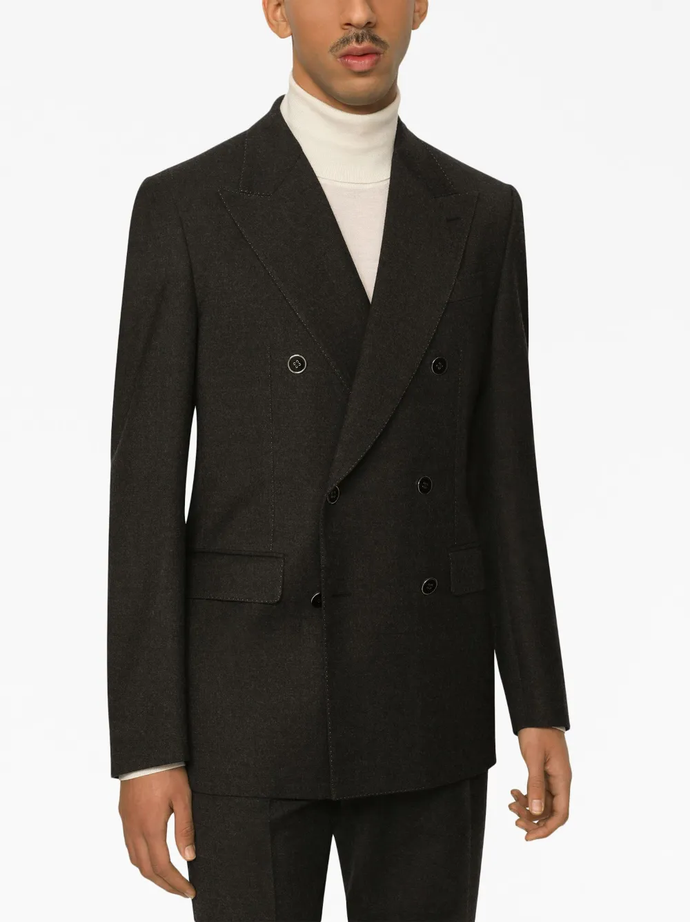 Угольно-серый, эластичная шерсть, контрастная строчка, заостренные лацканы, двубортная застежка на кнопки, длинные рукава, манжеты на пуговицах, нагрудный прорезной карман, два передних кармана с клапанами, шлица по центру сзади, прямой подол и шелковая подкладка.
