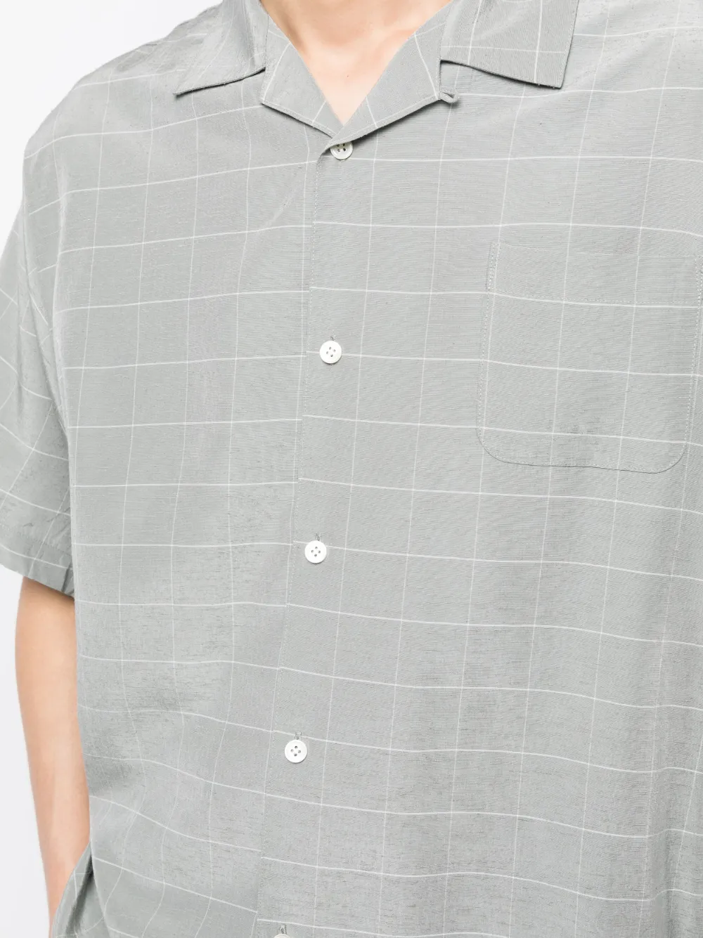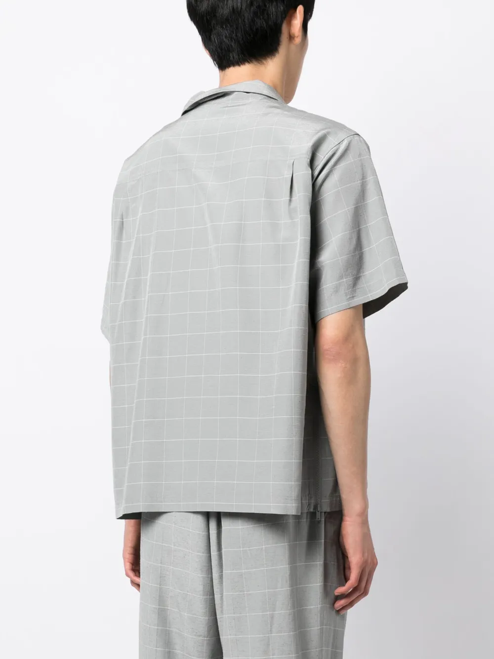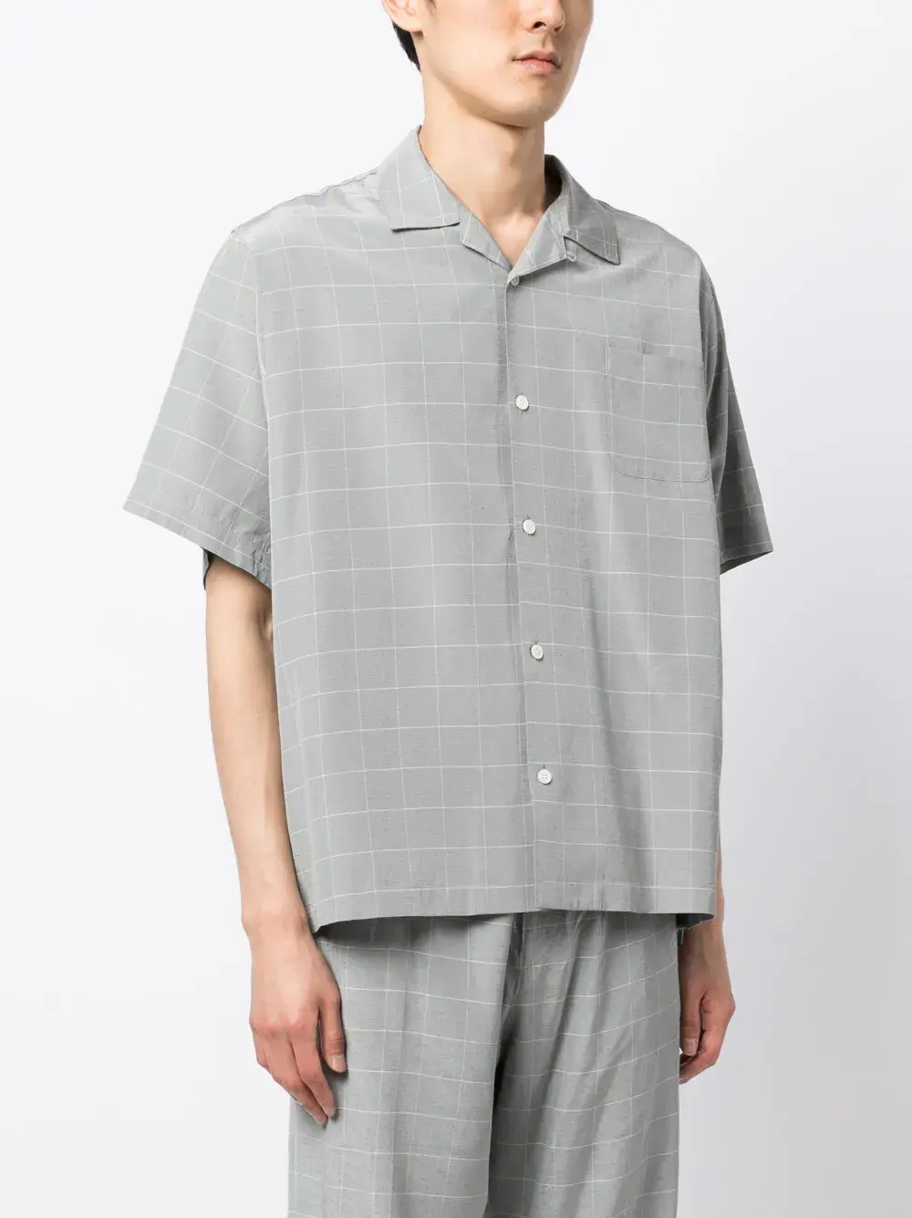 Светло-серый, смесовый шелк, клетчатый узор, отложный воротник, короткие рукава, застежка на пуговицах спереди и прямой подол.