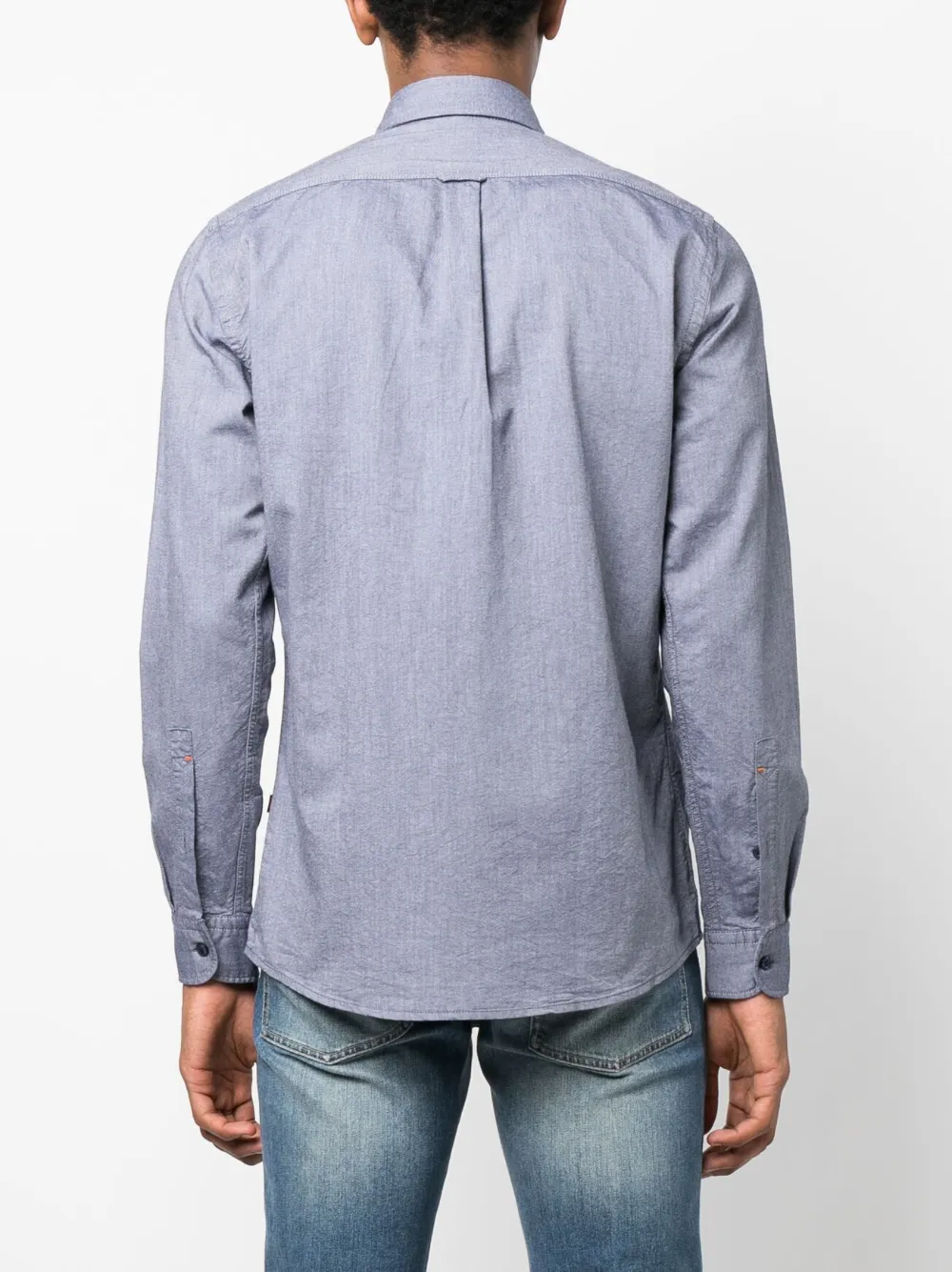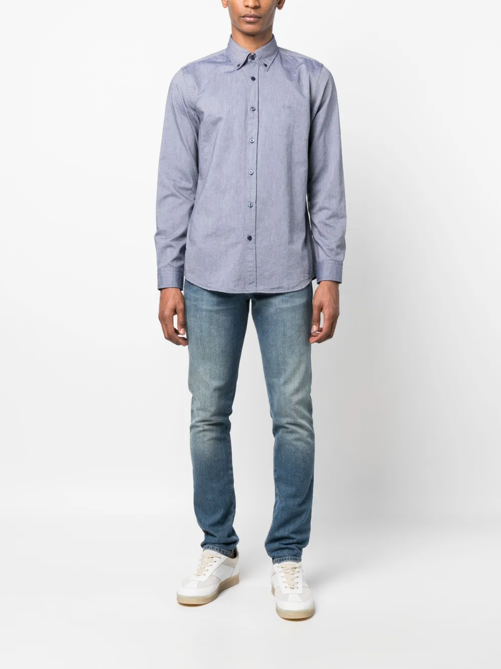 Расцветка Blue Tint, хлопок, вышитый логотип на груди, классический воротник, застежка на пуговицах спереди, длинные рукава и прямой подол.
