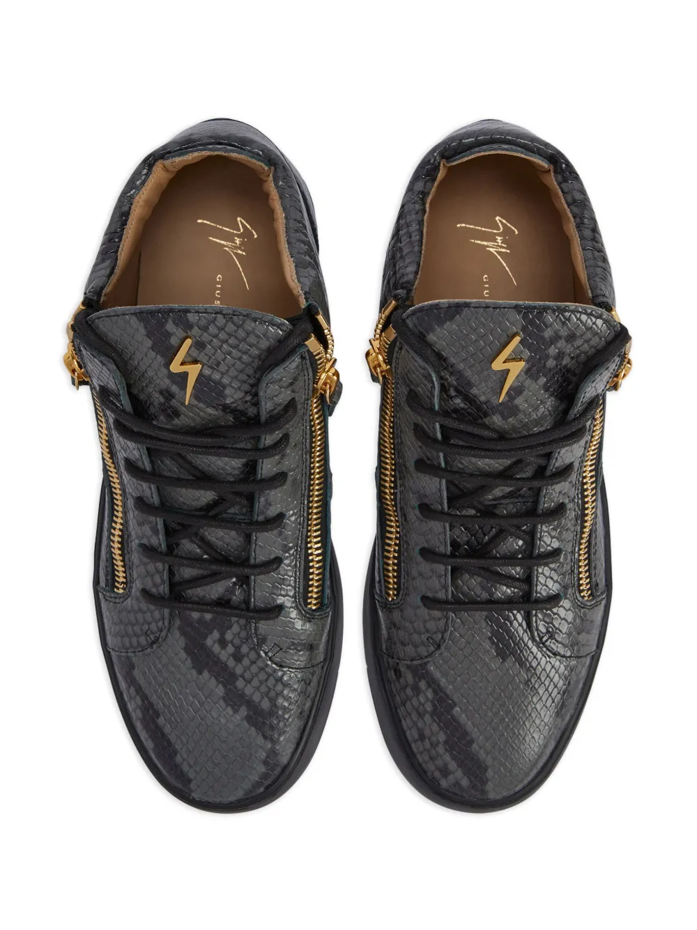Серый, кожа, эффект змеиной кожи, металлический логотип на язычке, застежка на молнии спереди, шнуровка спереди, закругленный носок, стелька с логотипом и плоская резиновая подошва.