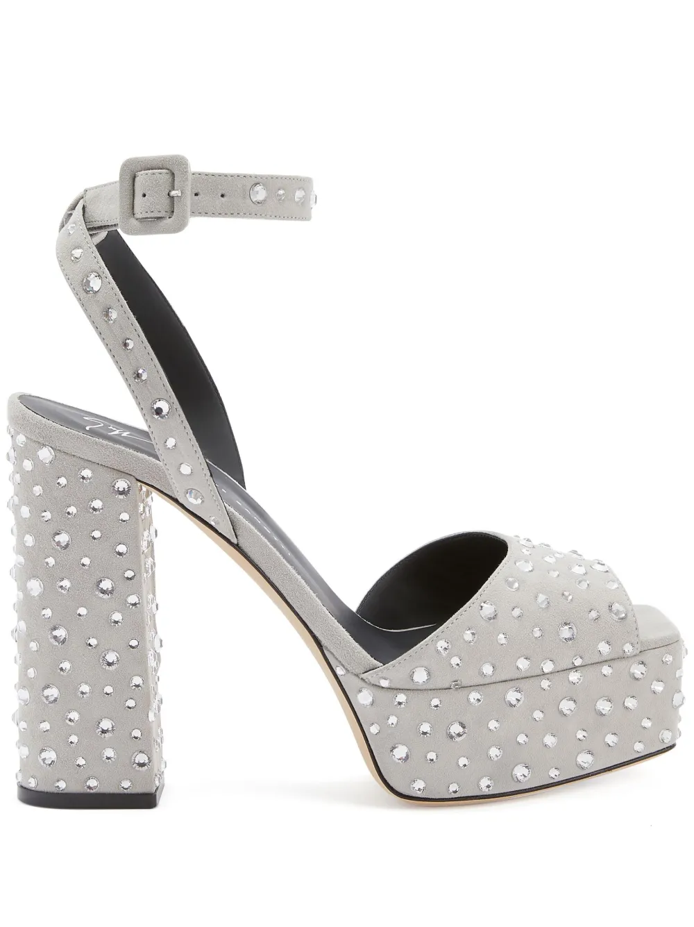 Светло-серый, замша, кожа, декор из кристаллов, стразы, квадратный носок, открытый носок, ремешок на щиколотке с пряжкой, стелька с логотипом, подошва на платформе и высокий блочный каблук.
